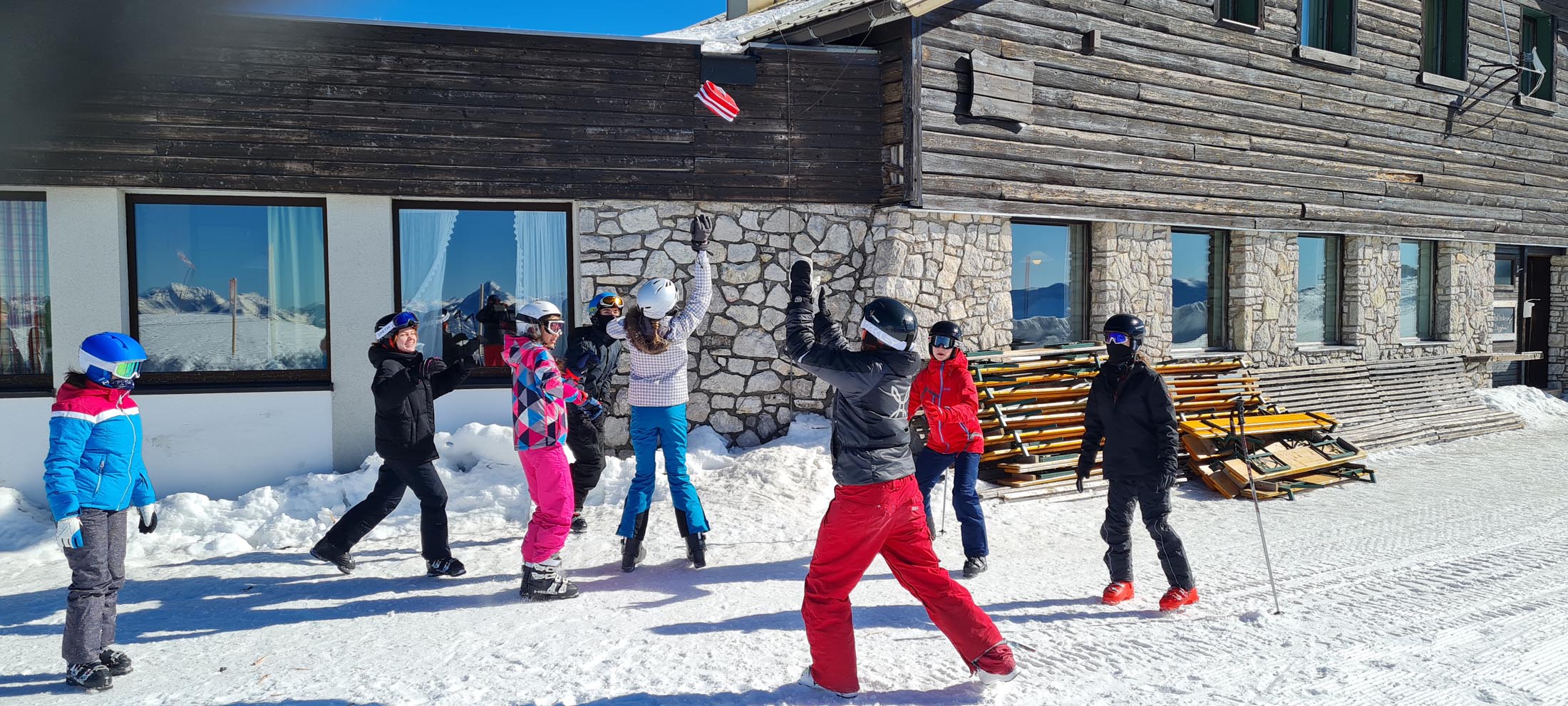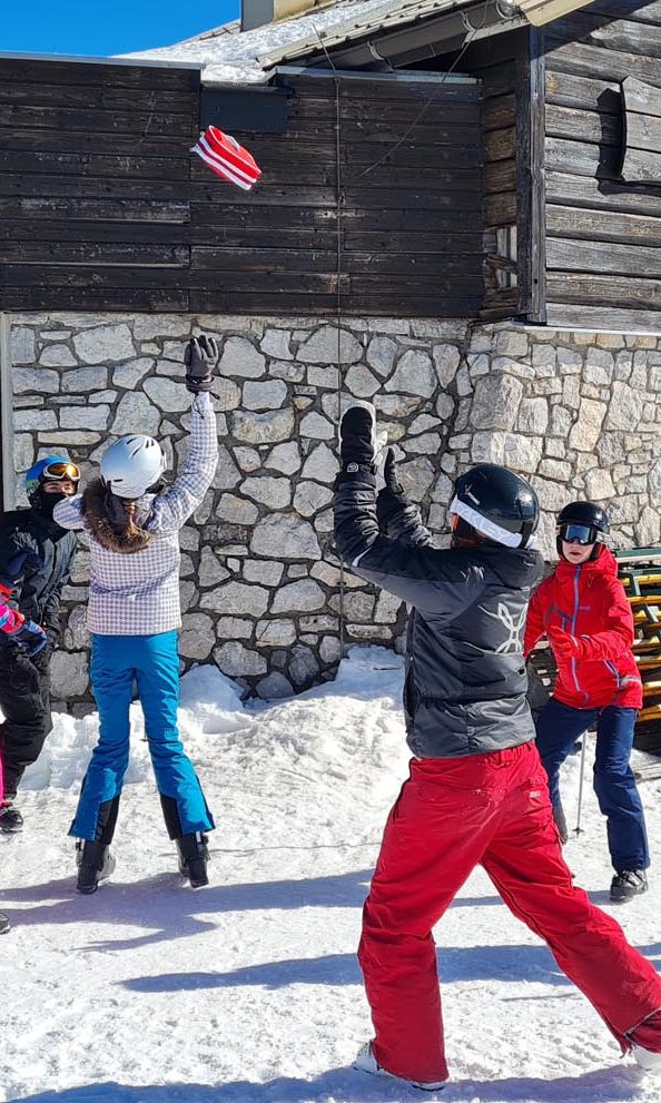 Tag 1 begann mit Skifahren bzw. Snowboarden vormittags und nachmittags, danach die erste Abendaktivität, „Das legendäre Völkerballturnier“. Auch wenn alle etwas müde und erschöpft waren, gaben alle Teams ihr Bestes, gewonnen hatte jedoch nur eines… die 1HMA, welche sich auch lautstark darüber freute.