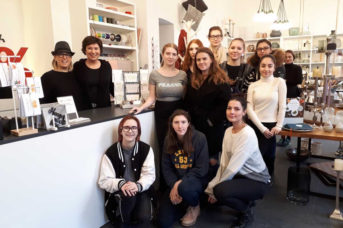 Wir, der dritte Jahrgang der Modeschule Herbststrasse besuchten im Rahmen des Modemarketing Unterrichtes den Concept Store Carmen & Antonia am Hamerlingplatz im 8. Bezirk. Das Label wurde vor zwei Jahren von Koni und Andrea gegründet und begann ursprünglich mit einem Cocktail in der Hand, mit Füßen im Pool und einer gemeinsamen Idee im Kopf. Koni ist eine ausgebildete Innenraum-Ausstatterin und Antonia eine selbstständige Graphik-Designerin. Durch ihre geteilte Leidenschaft für schöne Dinge, jahrelanger Berufserfahrung und mit Hilfe von Familienmitgliedern und Freunden, brachten sie den Mut auf, ihren eigenen Concept Store zu eröffnen. Im Store werden viele interessante Waren angeboten, anfangend von Interior-Dekoration bis hin zu Hundezubehör, Taschen und Postkarten. Das Duo erzählte uns ebenfalls offen über anfängliche Hürden, über die dazugehörigen wirtschaftlichen Aspekten und persönlichen Geschichten, die uns sehr fasziniert und inspiriert haben.