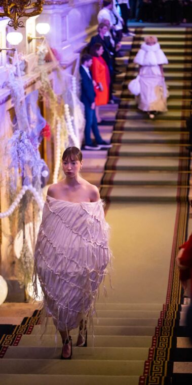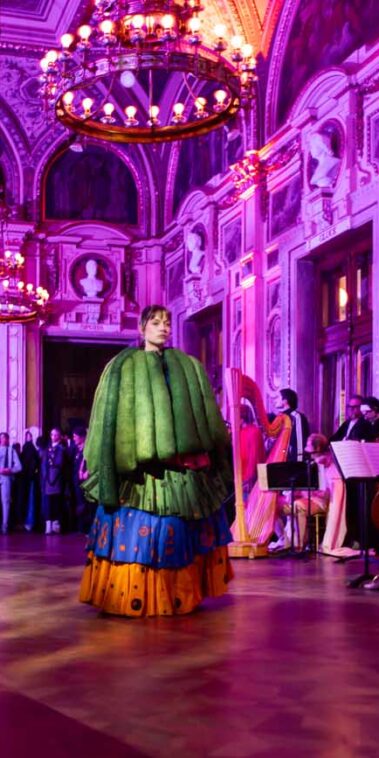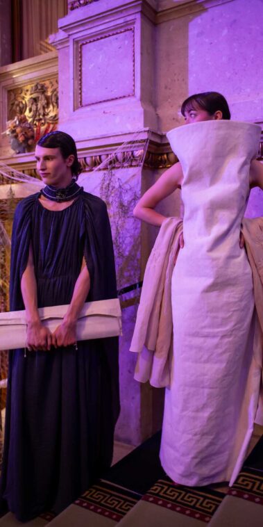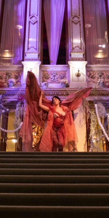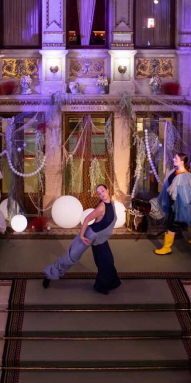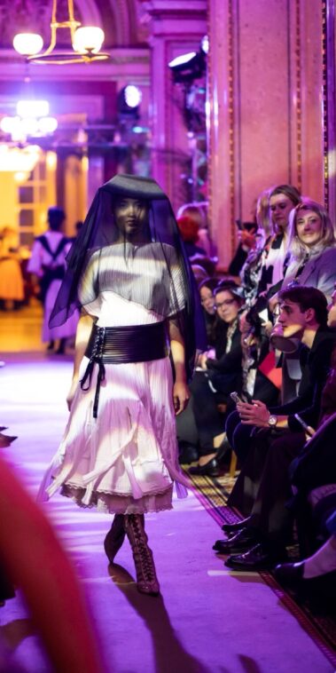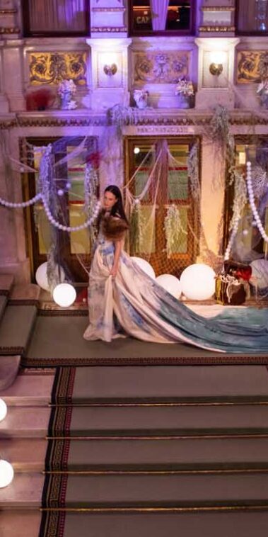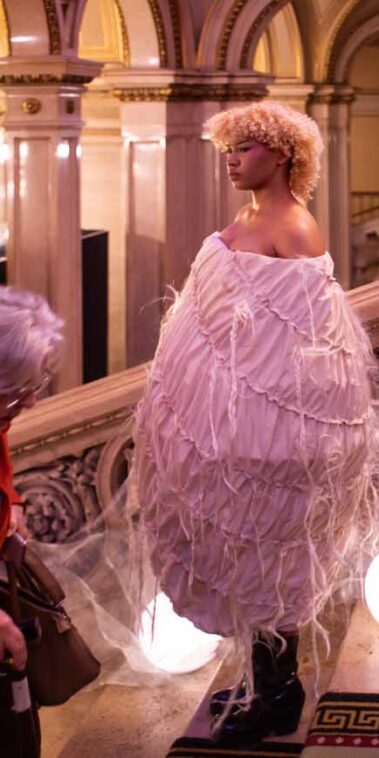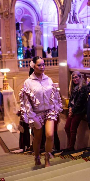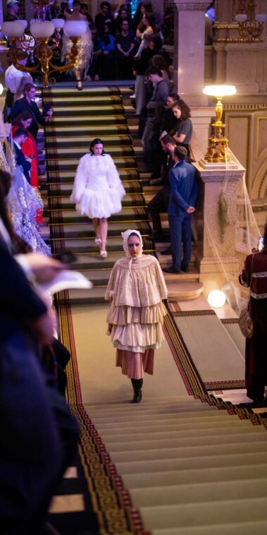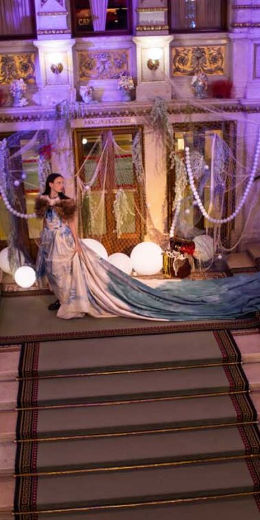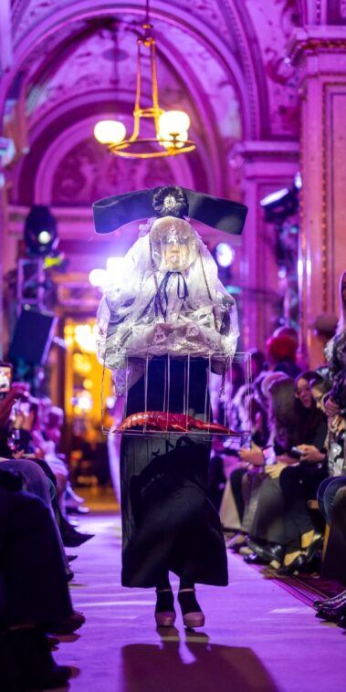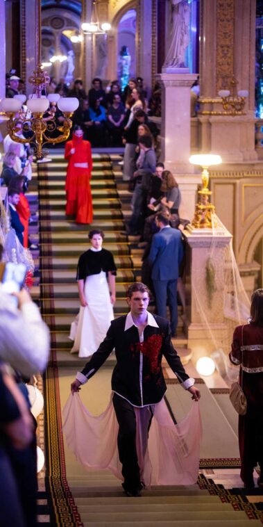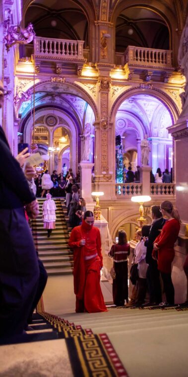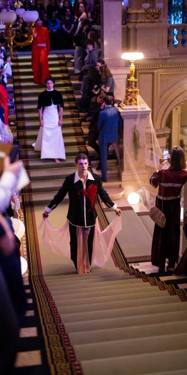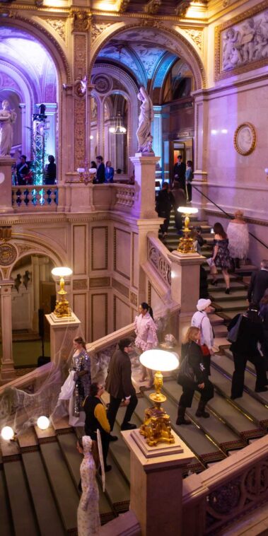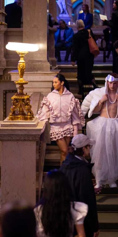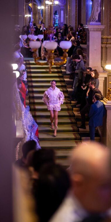 Auf der Feststiege und in den Prunkräumen der Wiener Staatsoper präsentierten 84 junge Designer:innen der KunstModeDesign Herbststrasse ihre eigenen Kollektionen. Die Entwürfe entstanden aus der Auseinandersetzung mit Themen, Musik und Figuren aus Georges Bizets Oper Les Pêcheurs de perles.