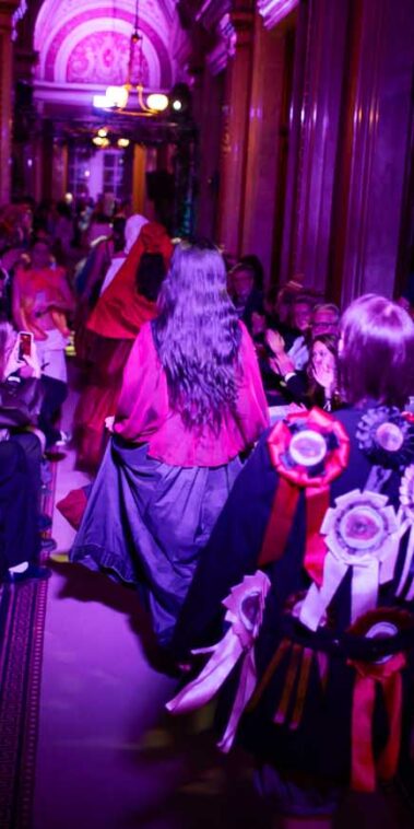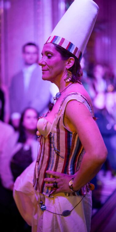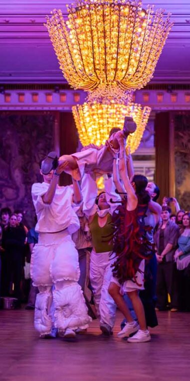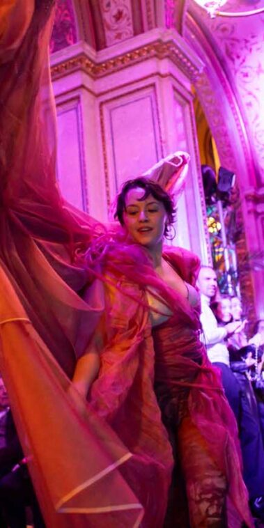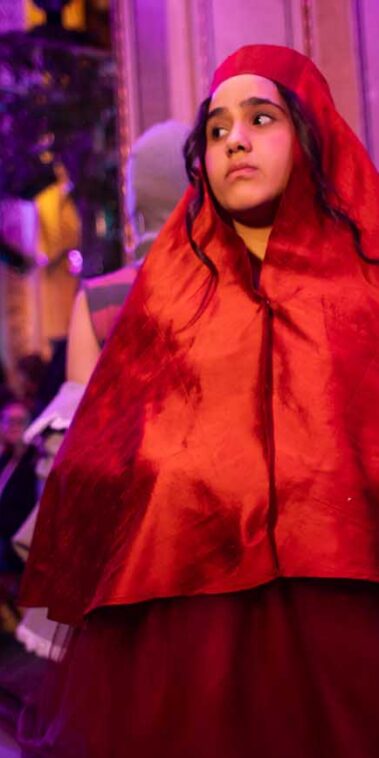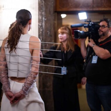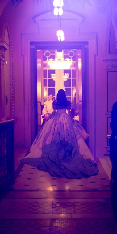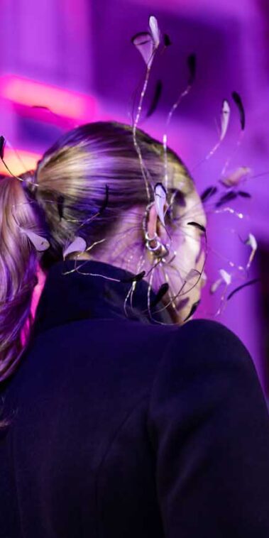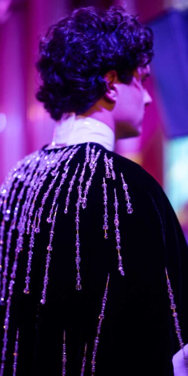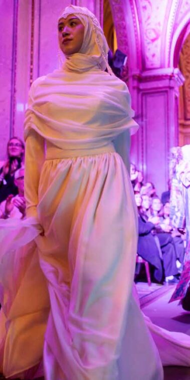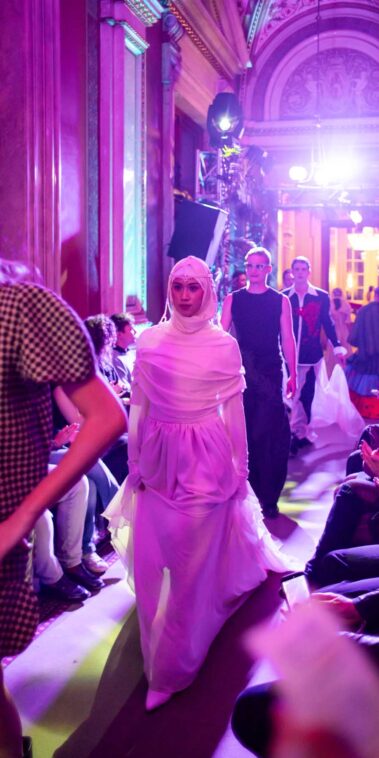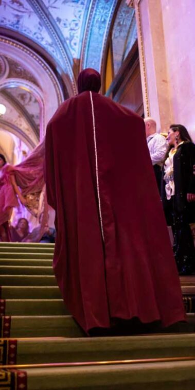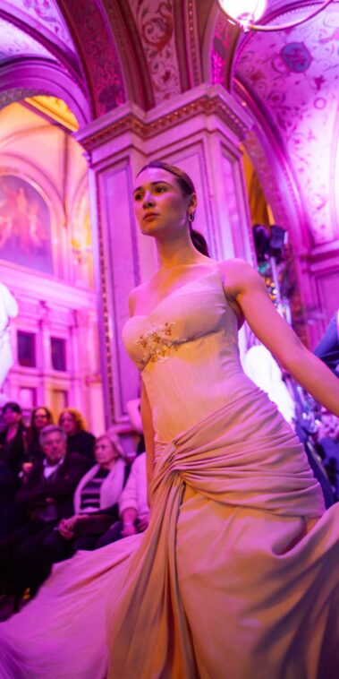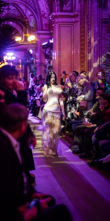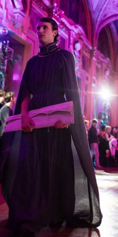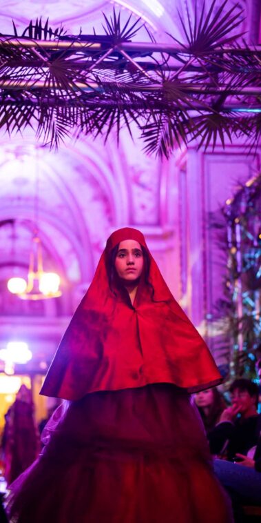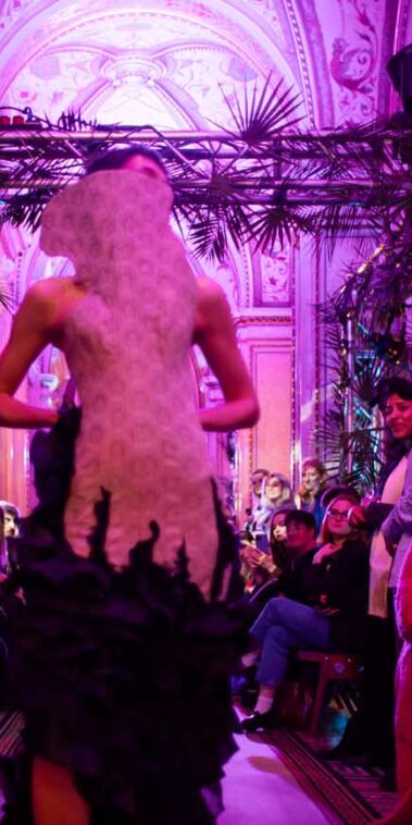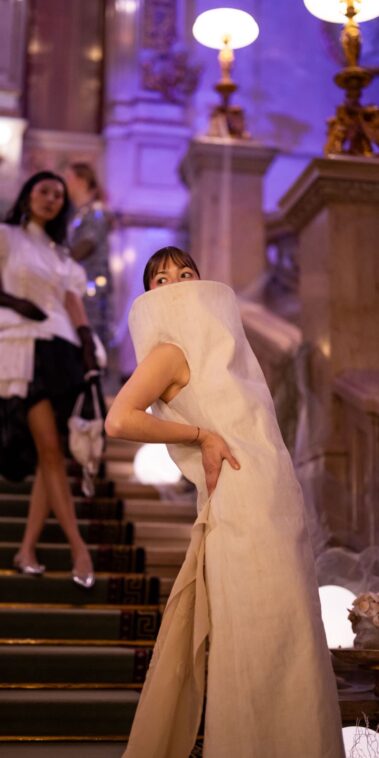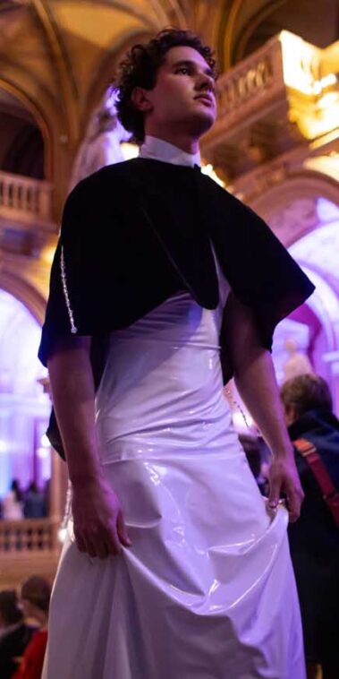Auf der Feststiege und in den Prunkräumen der Wiener Staatsoper präsentierten 84 junge Designer:innen der KunstModeDesign Herbststrasse ihre eigenen Kollektionen. Die Entwürfe entstanden aus der Auseinandersetzung mit Themen, Musik und Figuren aus Georges Bizets Oper Les Pêcheurs de perles.
