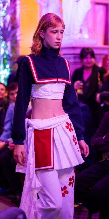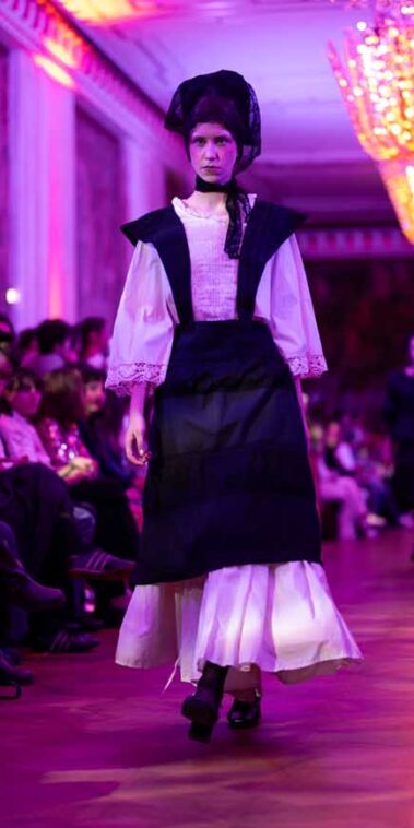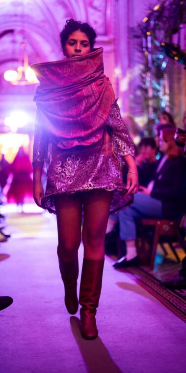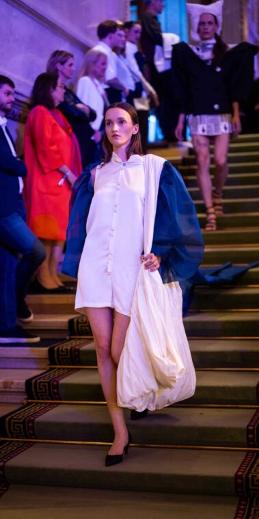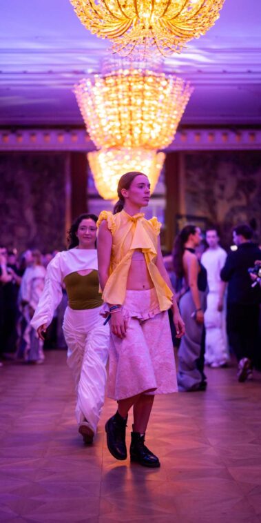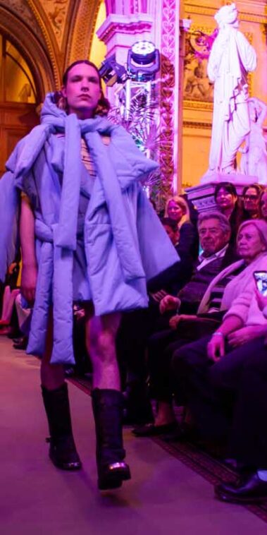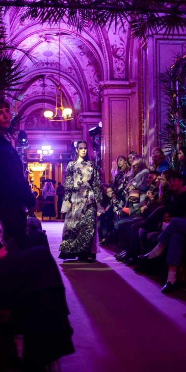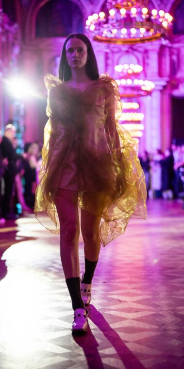 Die Models eroberten den außergewöhnlichen Laufsteg begleitet von Live-Electronics des Musikers und Produzenten Max Liebich sowie musikalischen Interventionen des Bühnenorchesters der Wiener Staatsoper. Nach der Fashionshow wandelten sich die Prunkräume der Oper in einen Club. Fashion meets Opera zeigte auch im dritten Jahr der Zusammenarbeit eindrucksvoll, wie junge Mode aus der KunstModeDesign Herbststrasse in Dialog mit einem traditionsreichen Kulturort treten kann.