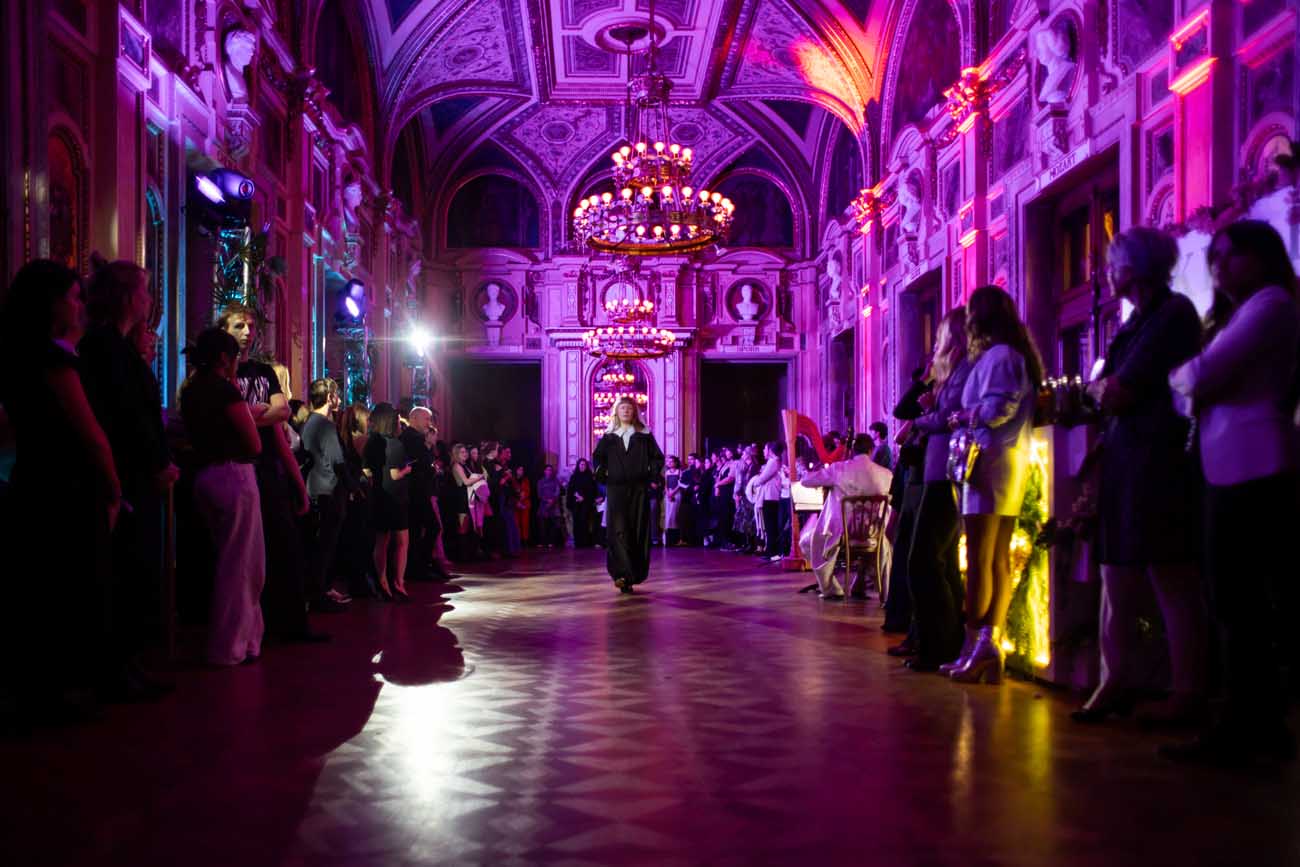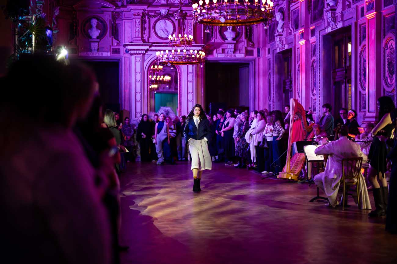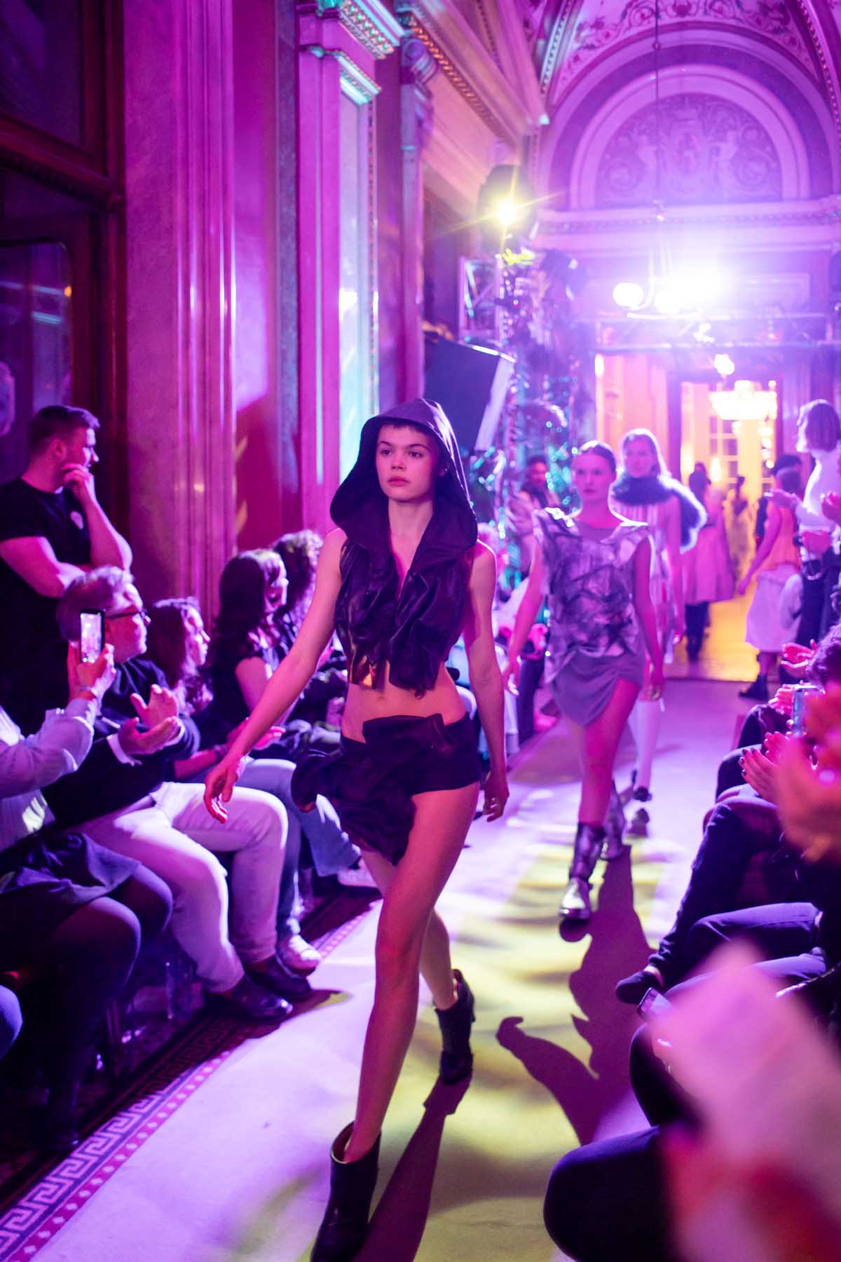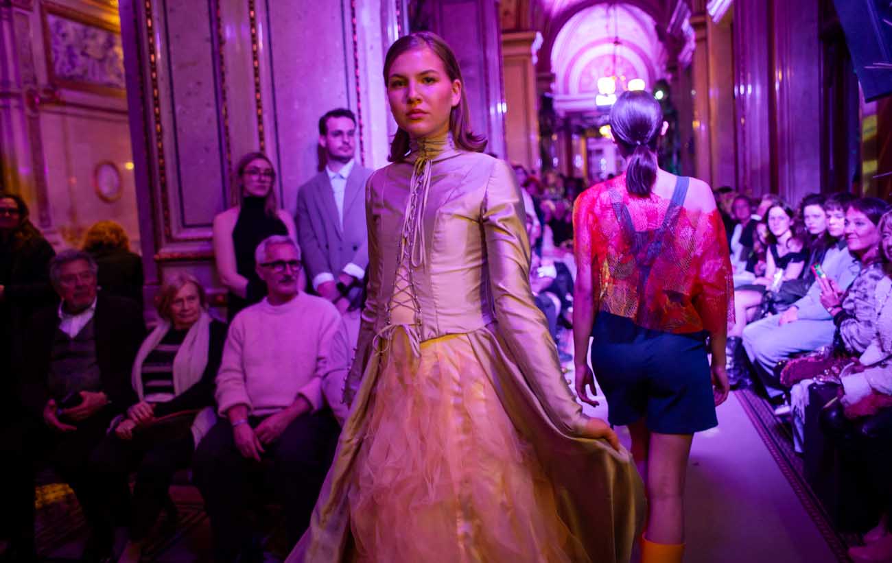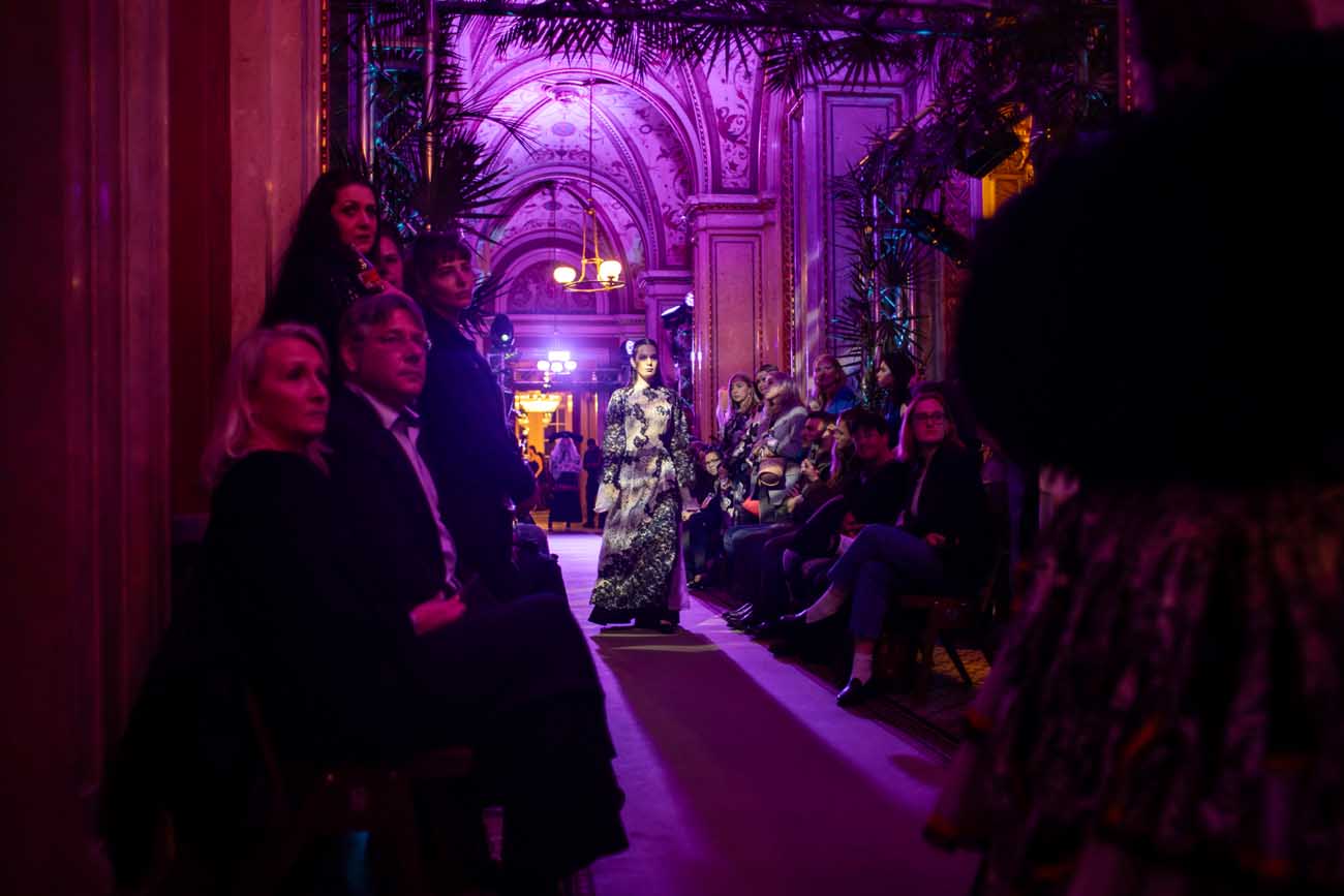 Die Models eroberten den außergewöhnlichen Laufsteg begleitet von Live-Electronics des Musikers und Produzenten Max Liebich sowie musikalischen Interventionen des Bühnenorchesters der Wiener Staatsoper. Nach der Fashionshow wandelten sich die Prunkräume der Oper in einen Club. Fashion meets Opera zeigte auch im dritten Jahr der Zusammenarbeit eindrucksvoll, wie junge Mode aus der KunstModeDesign Herbststrasse in Dialog mit einem traditionsreichen Kulturort treten kann.