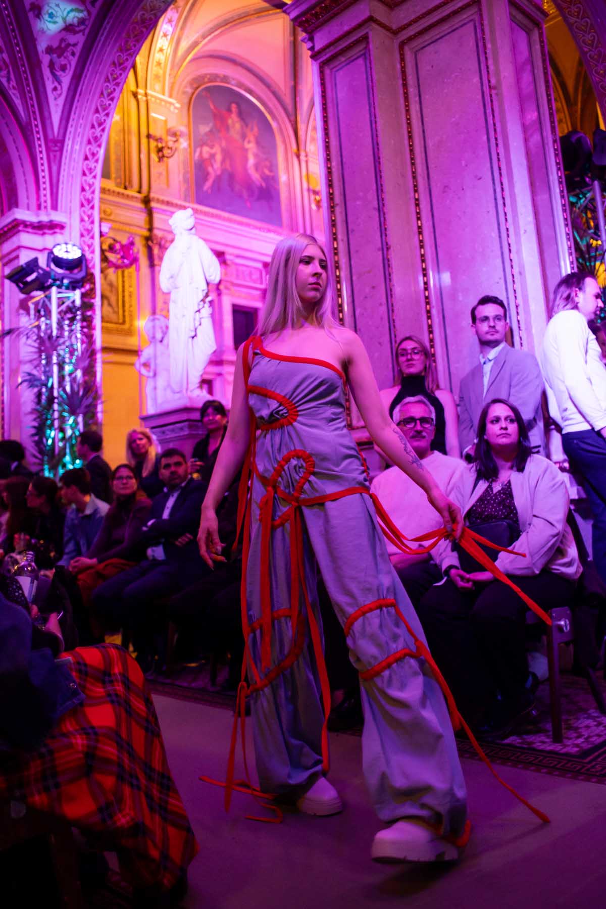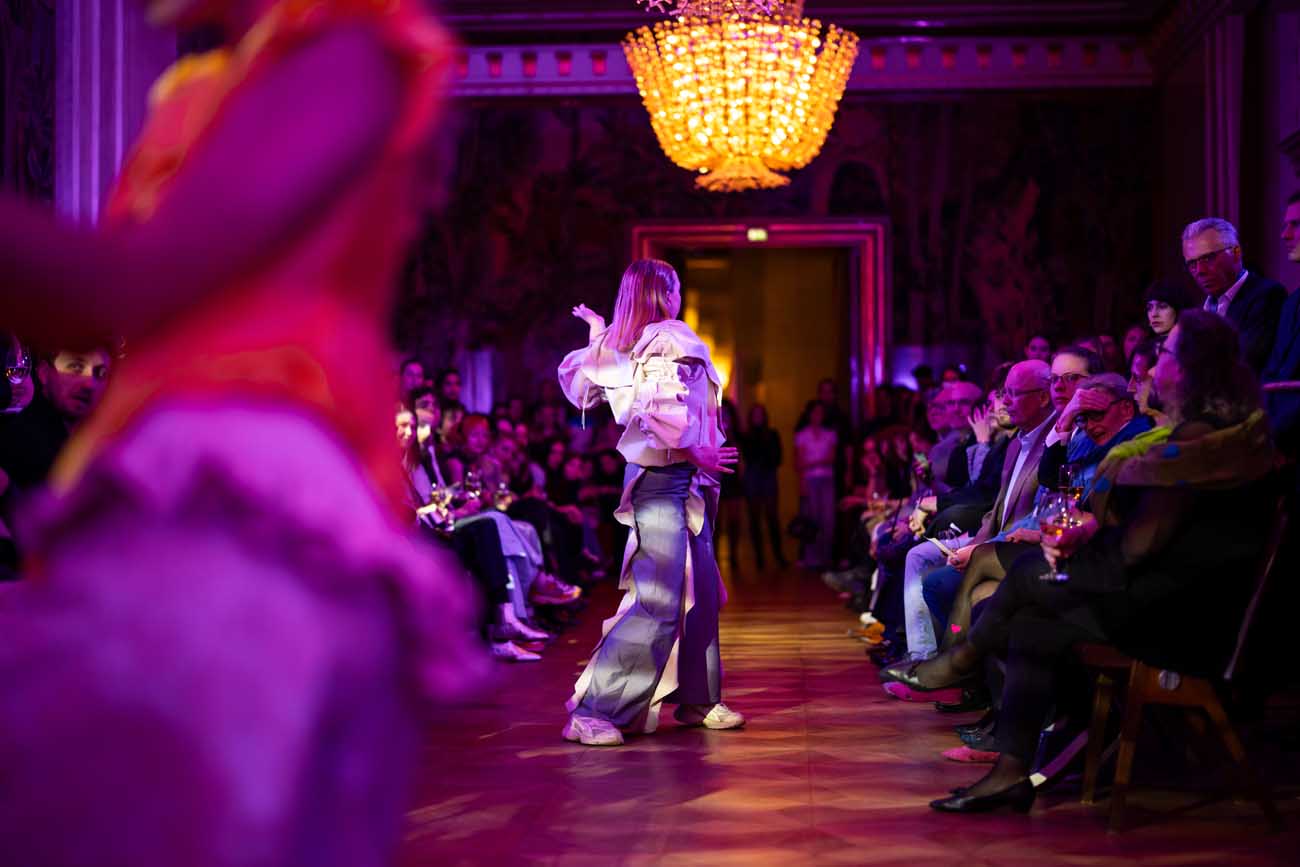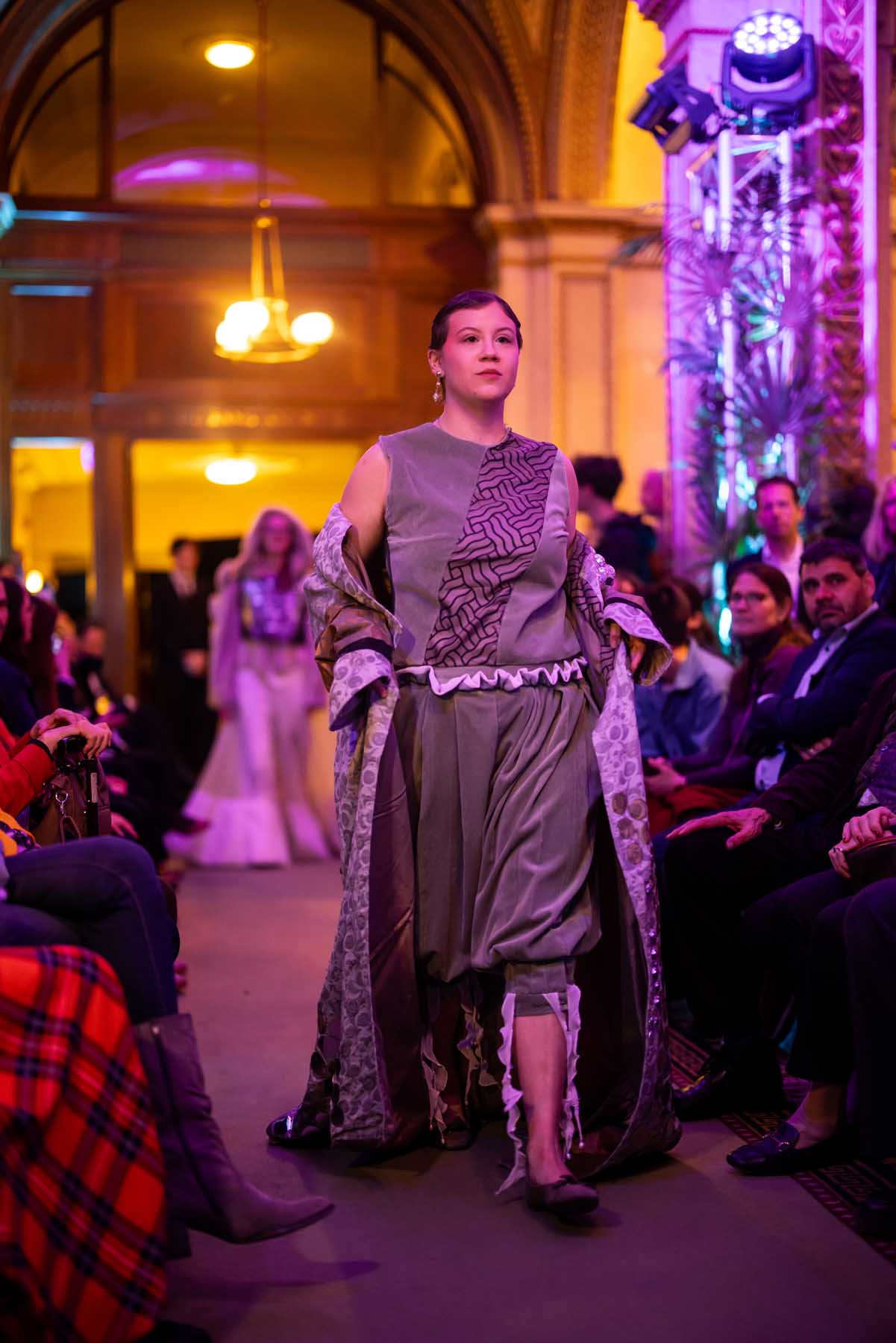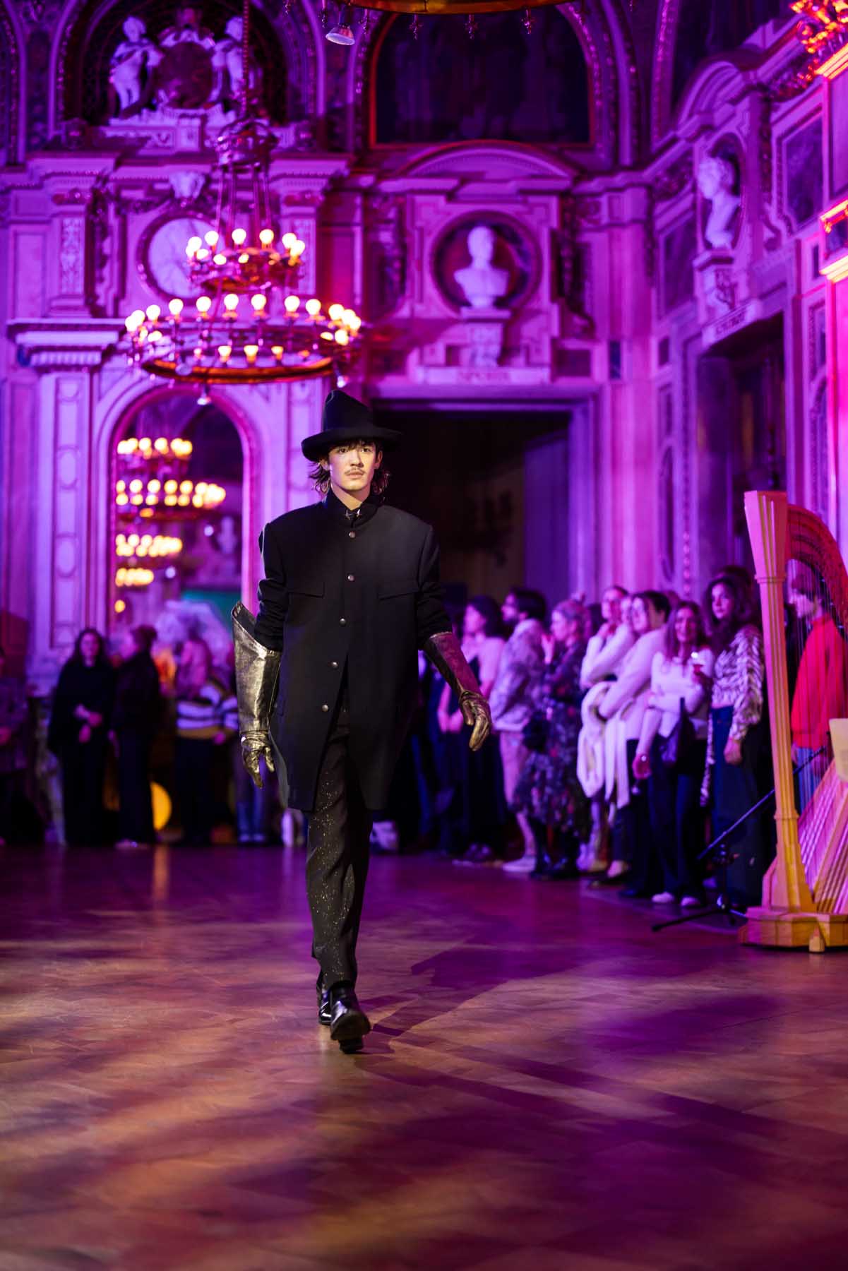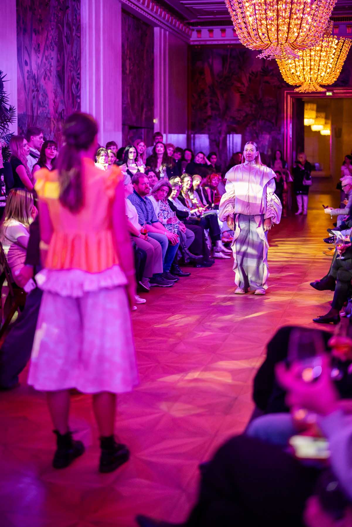 Die Models eroberten den außergewöhnlichen Laufsteg begleitet von Live-Electronics des Musikers und Produzenten Max Liebich sowie musikalischen Interventionen des Bühnenorchesters der Wiener Staatsoper. Nach der Fashionshow wandelten sich die Prunkräume der Oper in einen Club. Fashion meets Opera zeigte auch im dritten Jahr der Zusammenarbeit eindrucksvoll, wie junge Mode aus der KunstModeDesign Herbststrasse in Dialog mit einem traditionsreichen Kulturort treten kann.