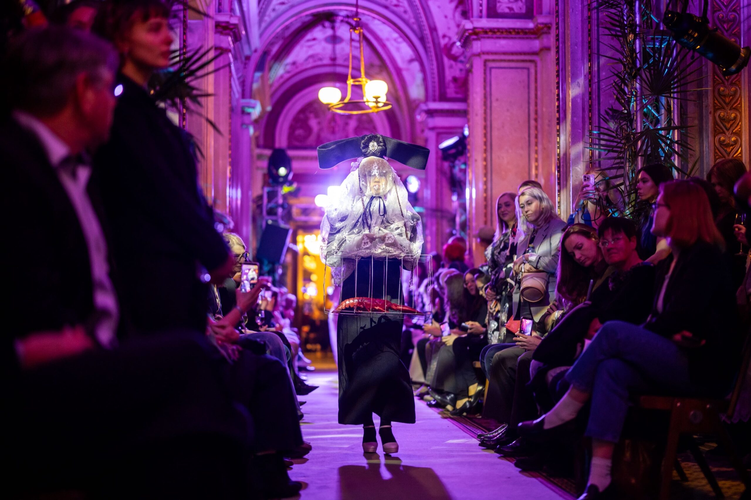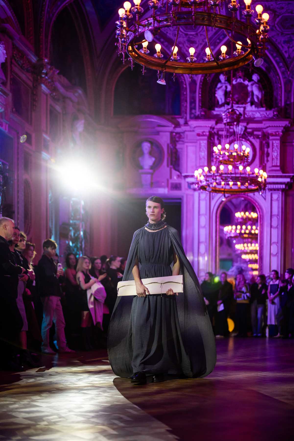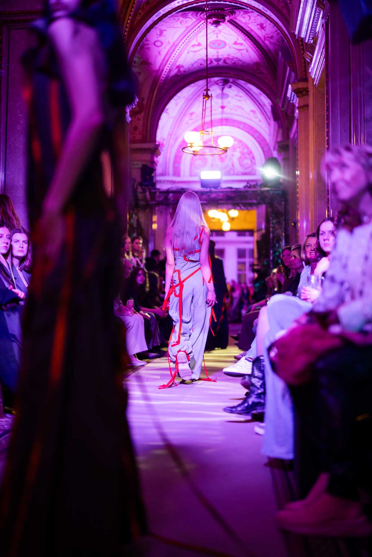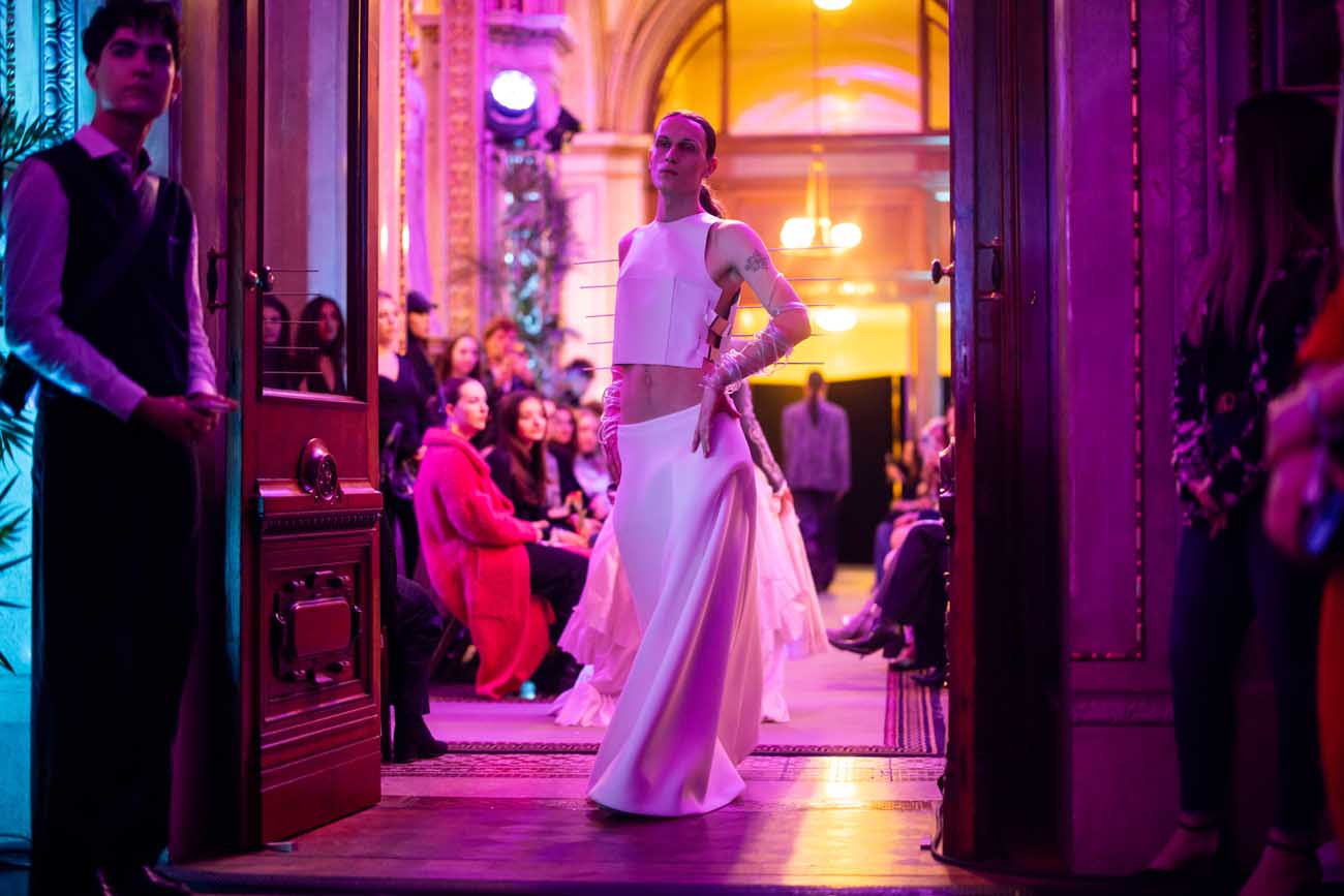 Die Models eroberten den außergewöhnlichen Laufsteg begleitet von Live-Electronics des Musikers und Produzenten Max Liebich sowie musikalischen Interventionen des Bühnenorchesters der Wiener Staatsoper. Nach der Fashionshow wandelten sich die Prunkräume der Oper in einen Club. Fashion meets Opera zeigte auch im dritten Jahr der Zusammenarbeit eindrucksvoll, wie junge Mode aus der KunstModeDesign Herbststrasse in Dialog mit einem traditionsreichen Kulturort treten kann.