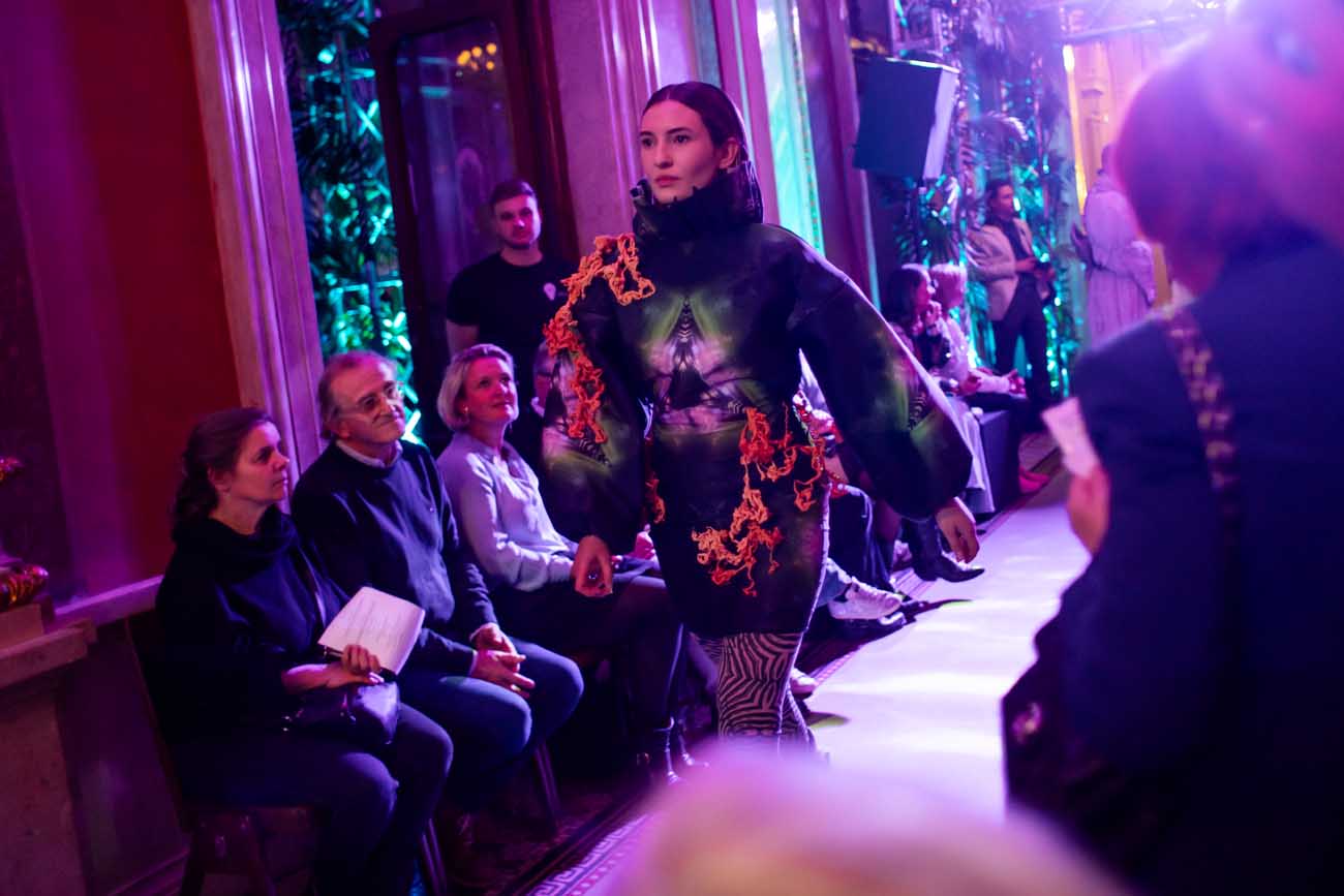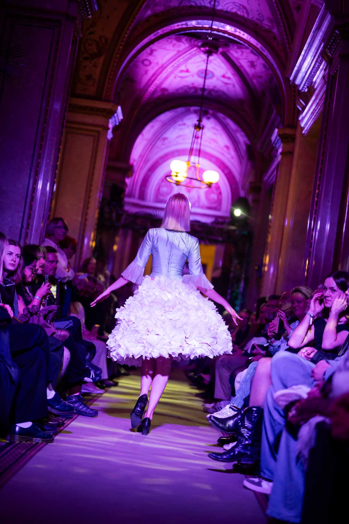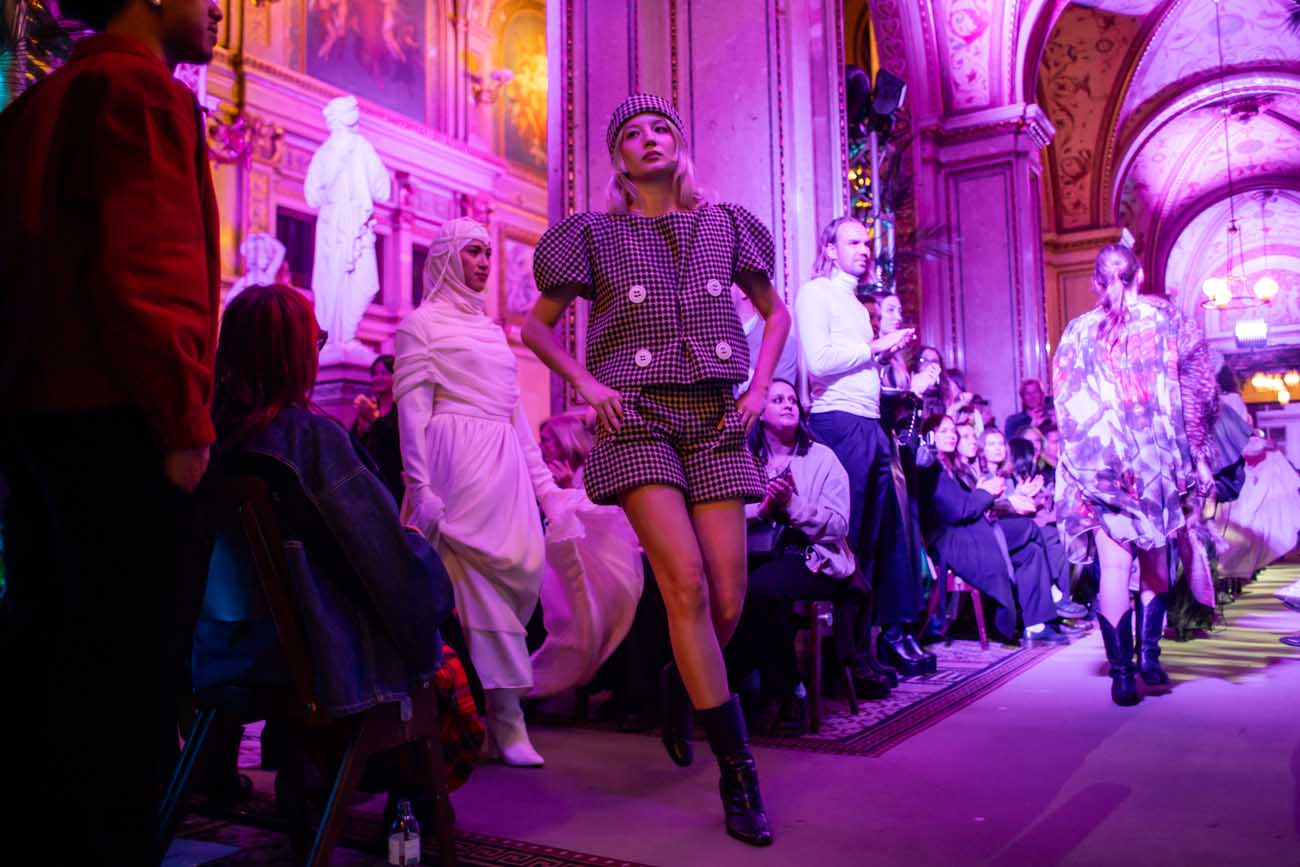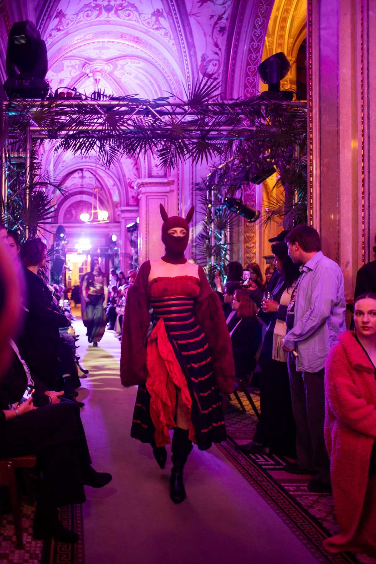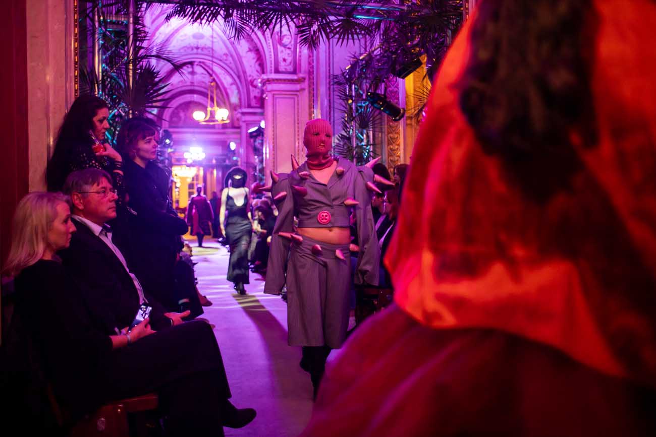 Die Models eroberten den außergewöhnlichen Laufsteg begleitet von Live-Electronics des Musikers und Produzenten Max Liebich sowie musikalischen Interventionen des Bühnenorchesters der Wiener Staatsoper. Nach der Fashionshow wandelten sich die Prunkräume der Oper in einen Club. Fashion meets Opera zeigte auch im dritten Jahr der Zusammenarbeit eindrucksvoll, wie junge Mode aus der KunstModeDesign Herbststrasse in Dialog mit einem traditionsreichen Kulturort treten kann.