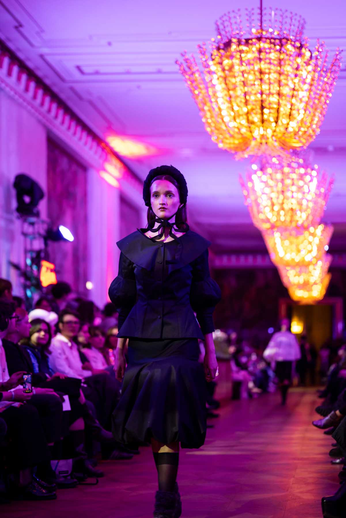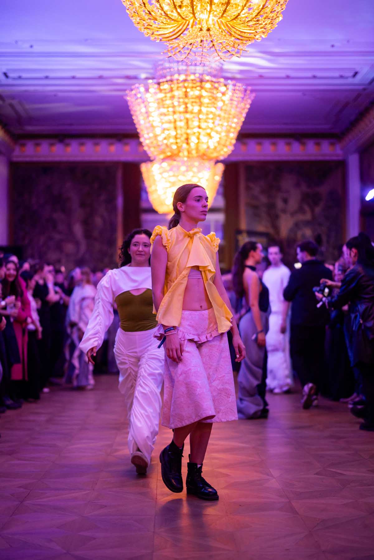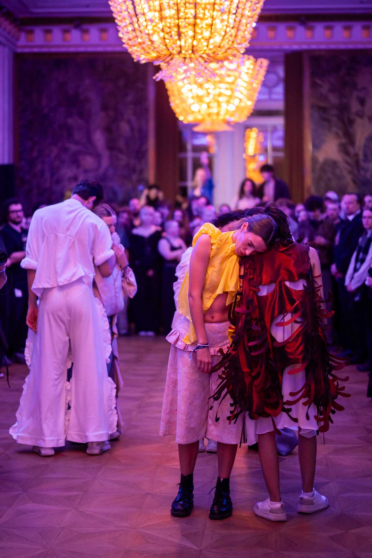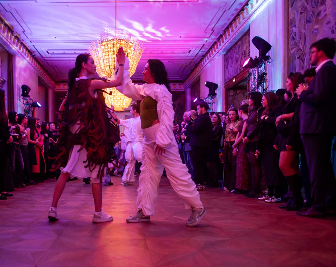 Die Models eroberten den außergewöhnlichen Laufsteg begleitet von Live-Electronics des Musikers und Produzenten Max Liebich sowie musikalischen Interventionen des Bühnenorchesters der Wiener Staatsoper. Nach der Fashionshow wandelten sich die Prunkräume der Oper in einen Club. Fashion meets Opera zeigte auch im dritten Jahr der Zusammenarbeit eindrucksvoll, wie junge Mode aus der KunstModeDesign Herbststrasse in Dialog mit einem traditionsreichen Kulturort treten kann.