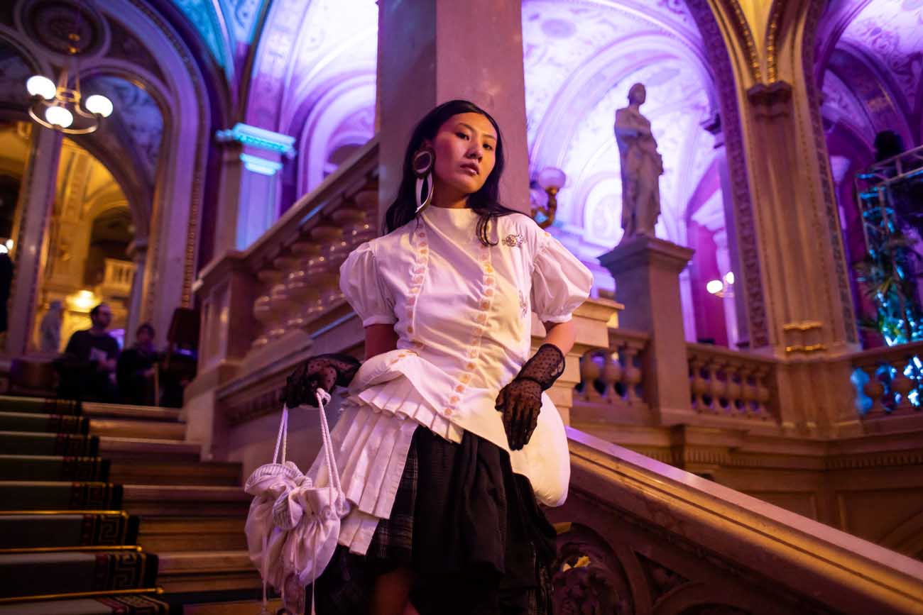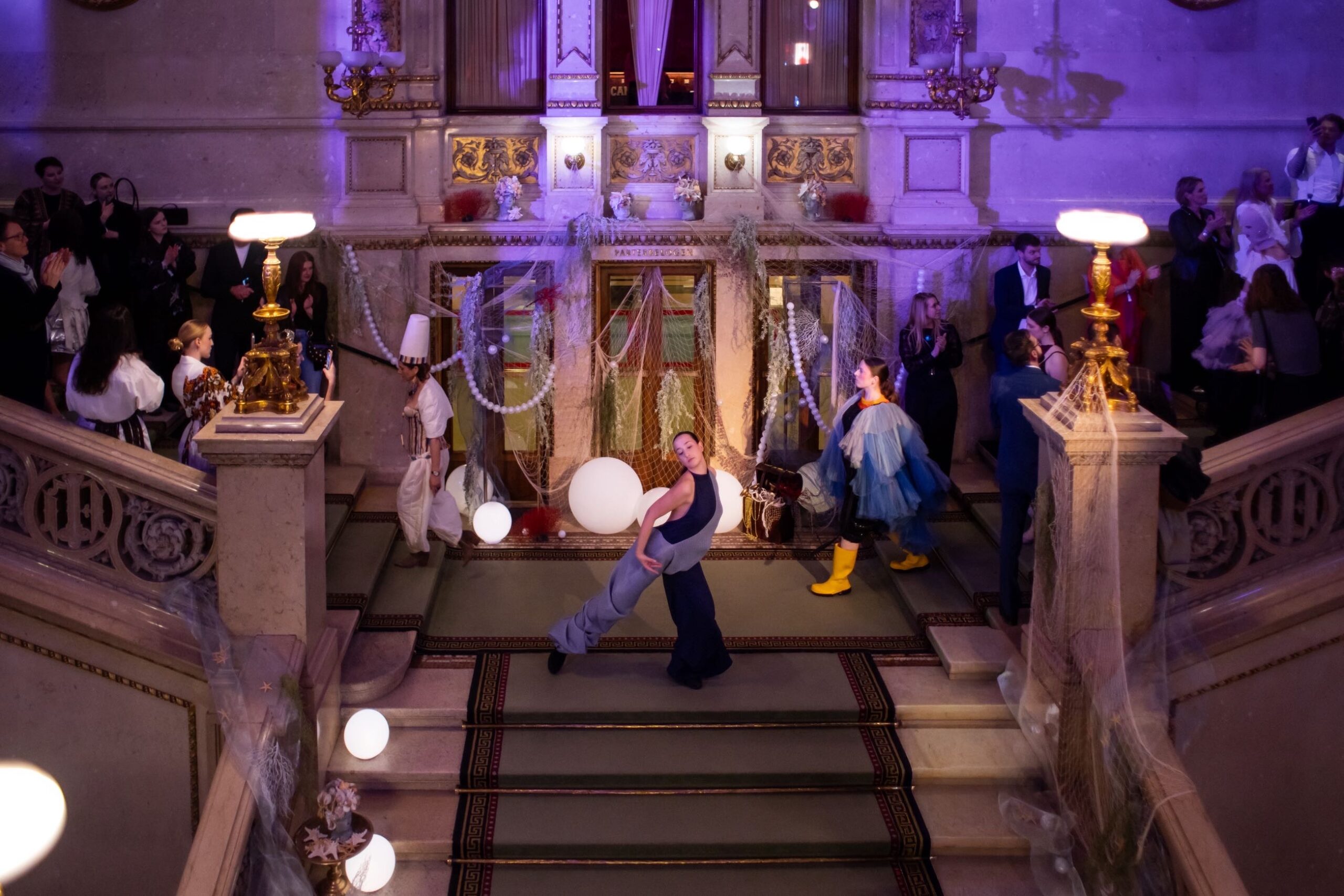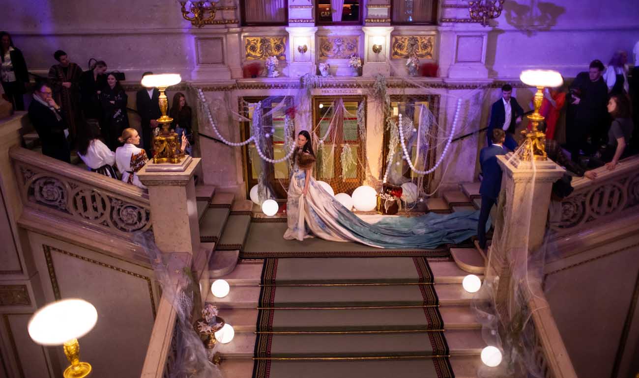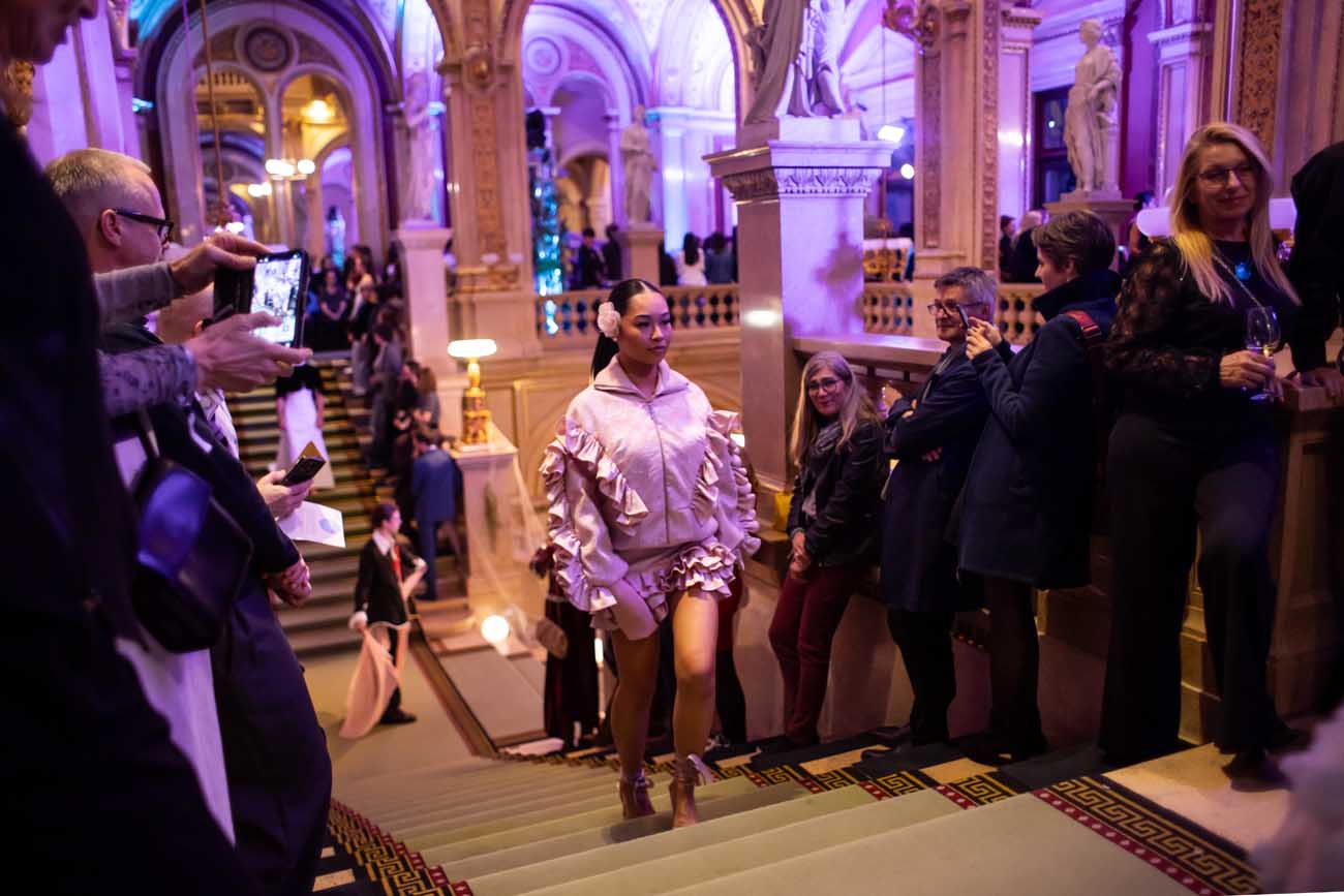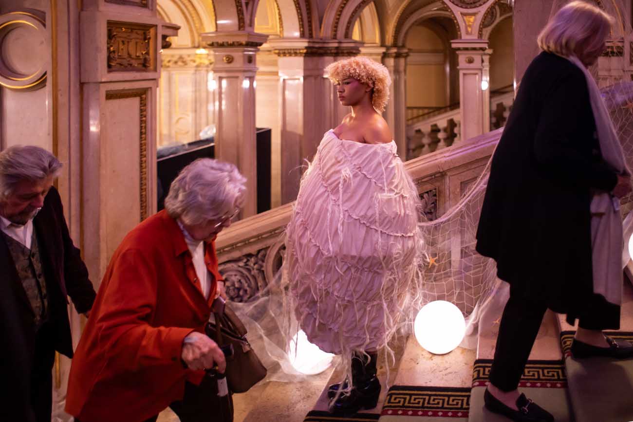 Auf der Feststiege und in den Prunkräumen der Wiener Staatsoper präsentierten 84 junge Designer:innen der KunstModeDesign Herbststrasse ihre eigenen Kollektionen. Die Entwürfe entstanden aus der Auseinandersetzung mit Themen, Musik und Figuren aus Georges Bizets Oper Les Pêcheurs de perles.