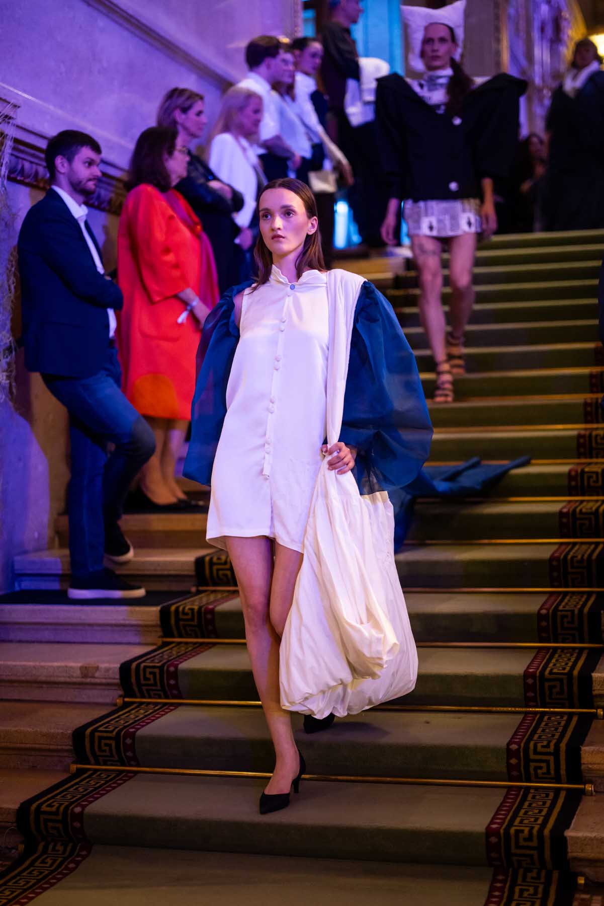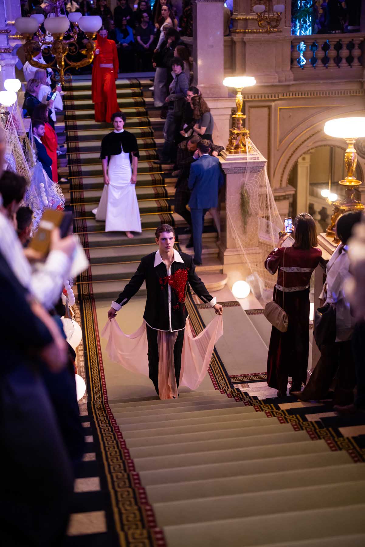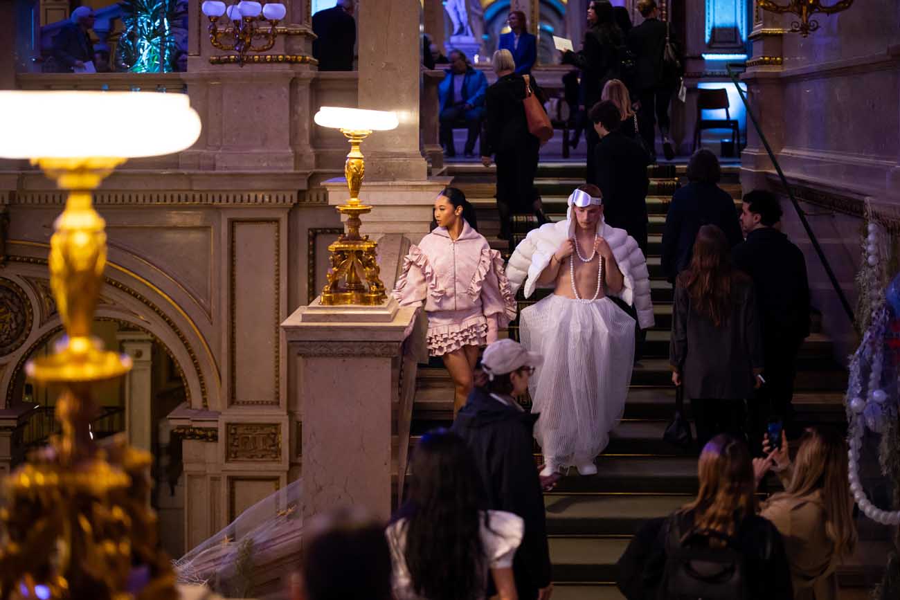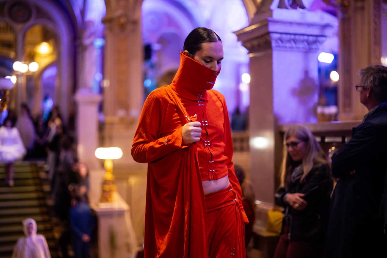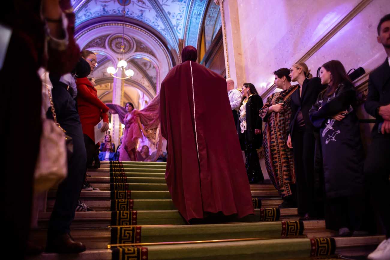 Auf der Feststiege und in den Prunkräumen der Wiener Staatsoper präsentierten 84 junge Designer:innen der KunstModeDesign Herbststrasse ihre eigenen Kollektionen. Die Entwürfe entstanden aus der Auseinandersetzung mit Themen, Musik und Figuren aus Georges Bizets Oper Les Pêcheurs de perles.