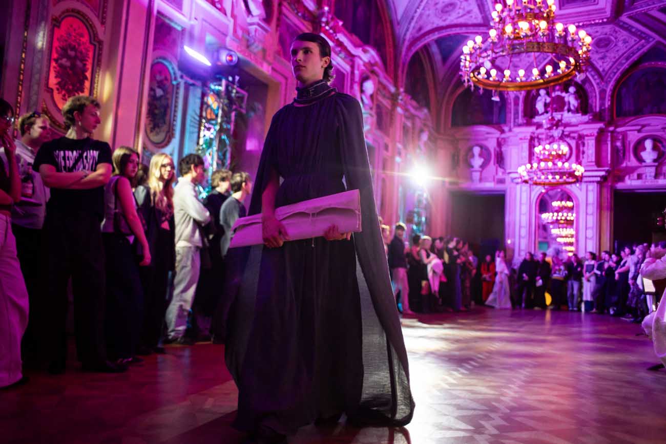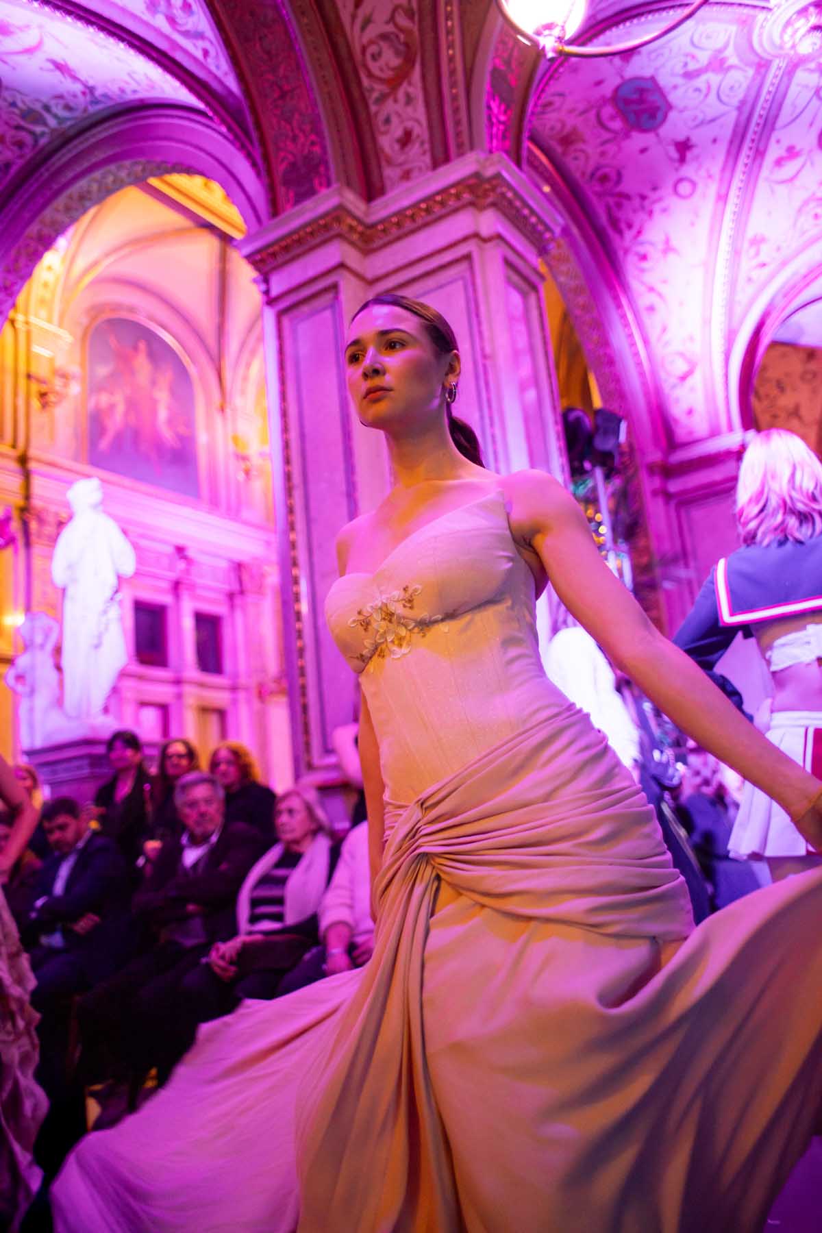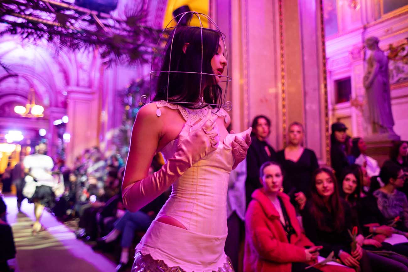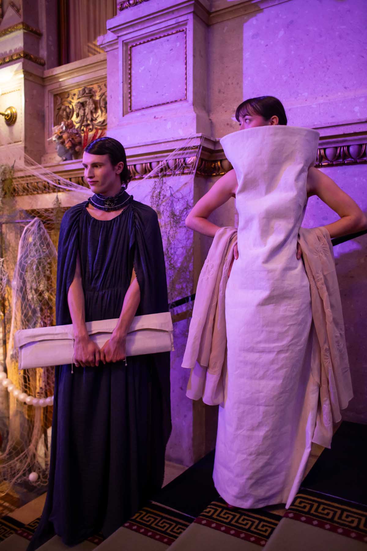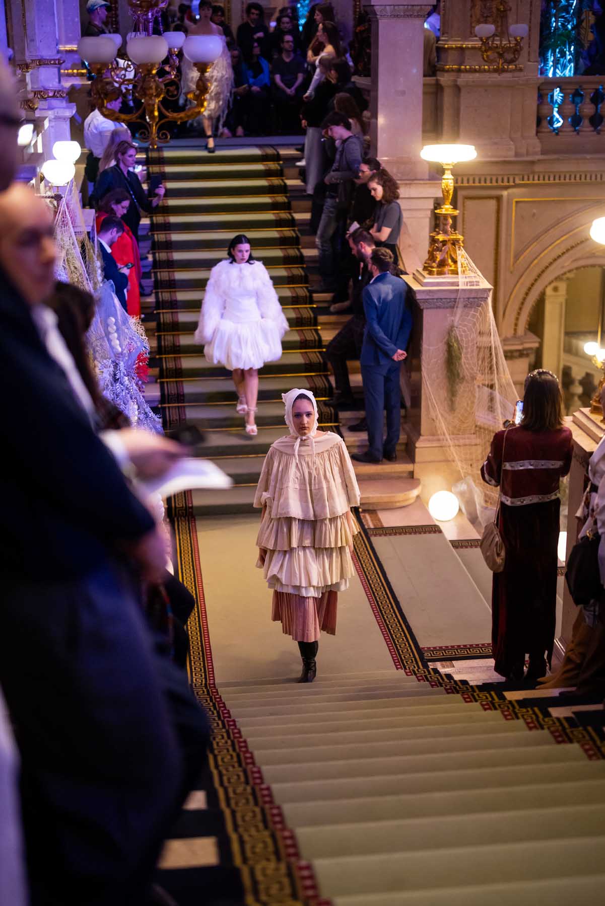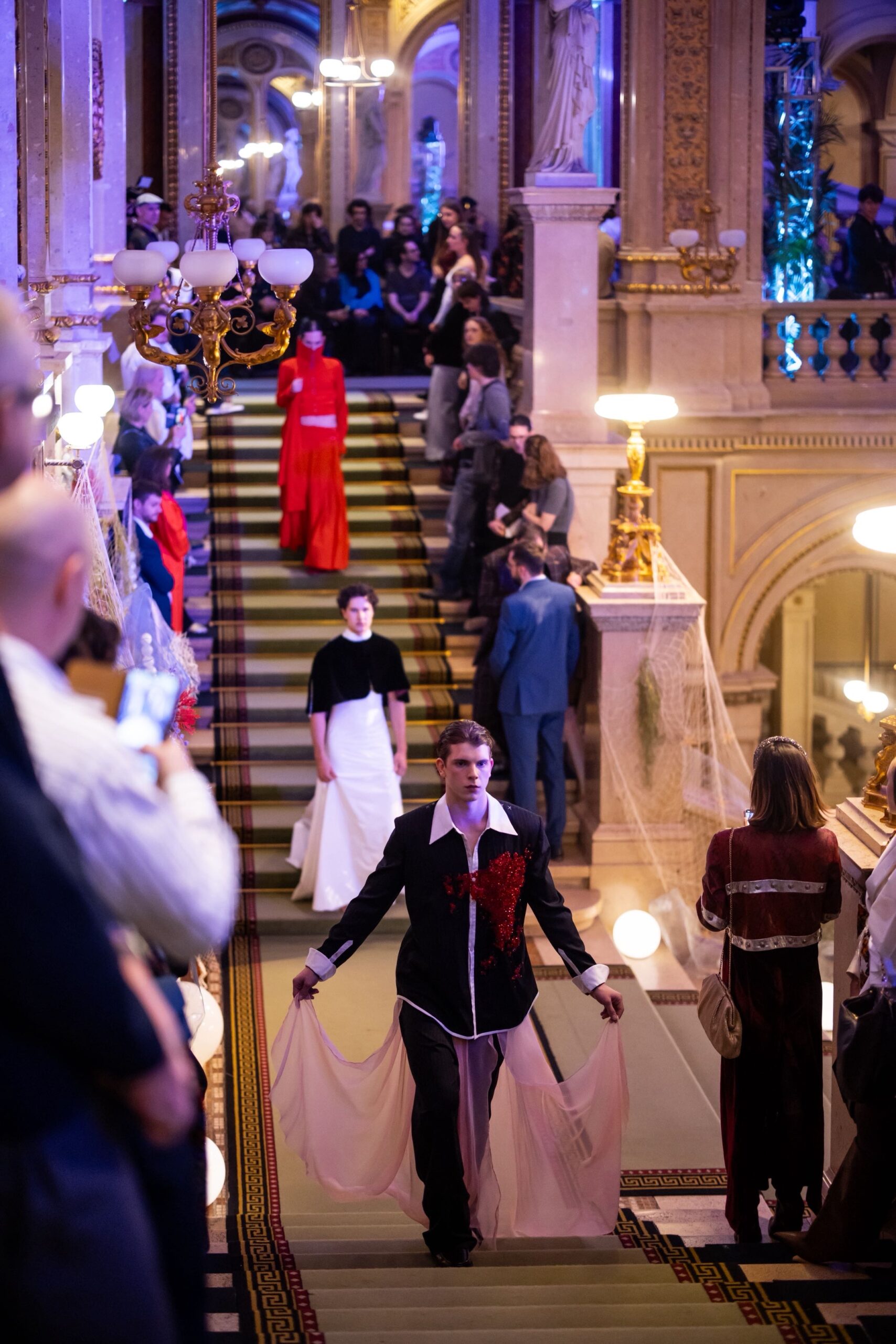 Auf der Feststiege und in den Prunkräumen der Wiener Staatsoper präsentierten 84 junge Designer:innen der KunstModeDesign Herbststrasse ihre eigenen Kollektionen. Die Entwürfe entstanden aus der Auseinandersetzung mit Themen, Musik und Figuren aus Georges Bizets Oper Les Pêcheurs de perles.