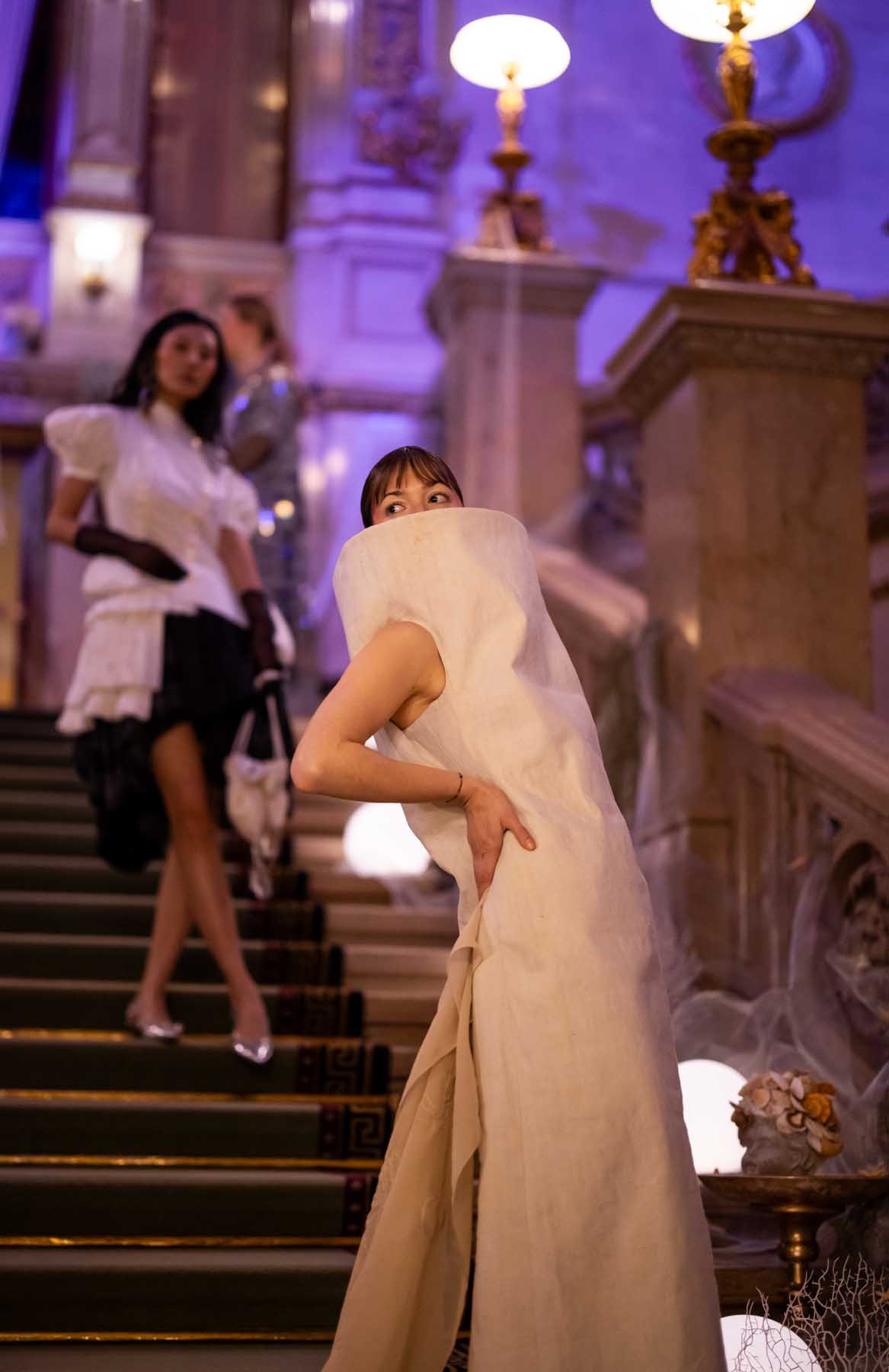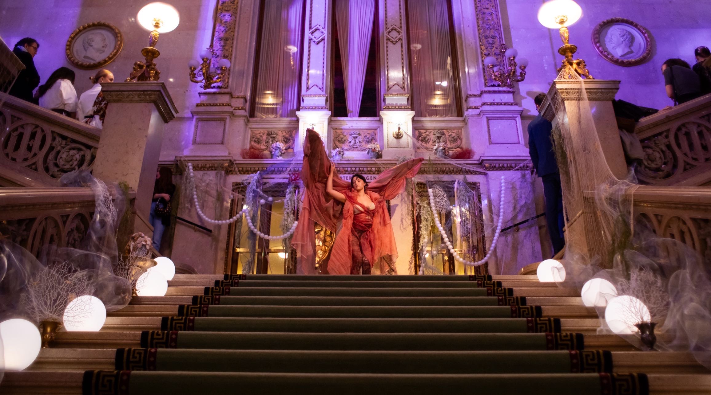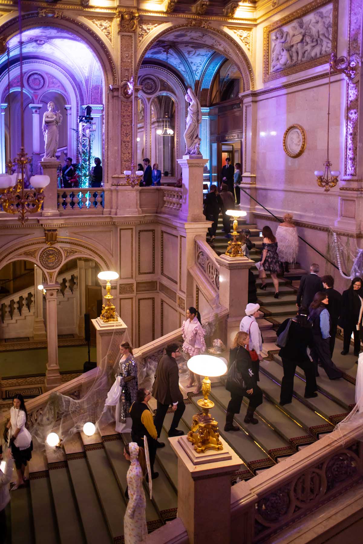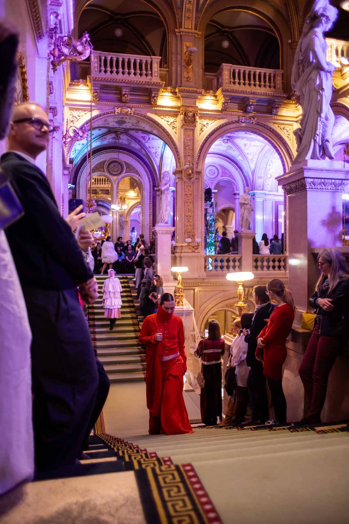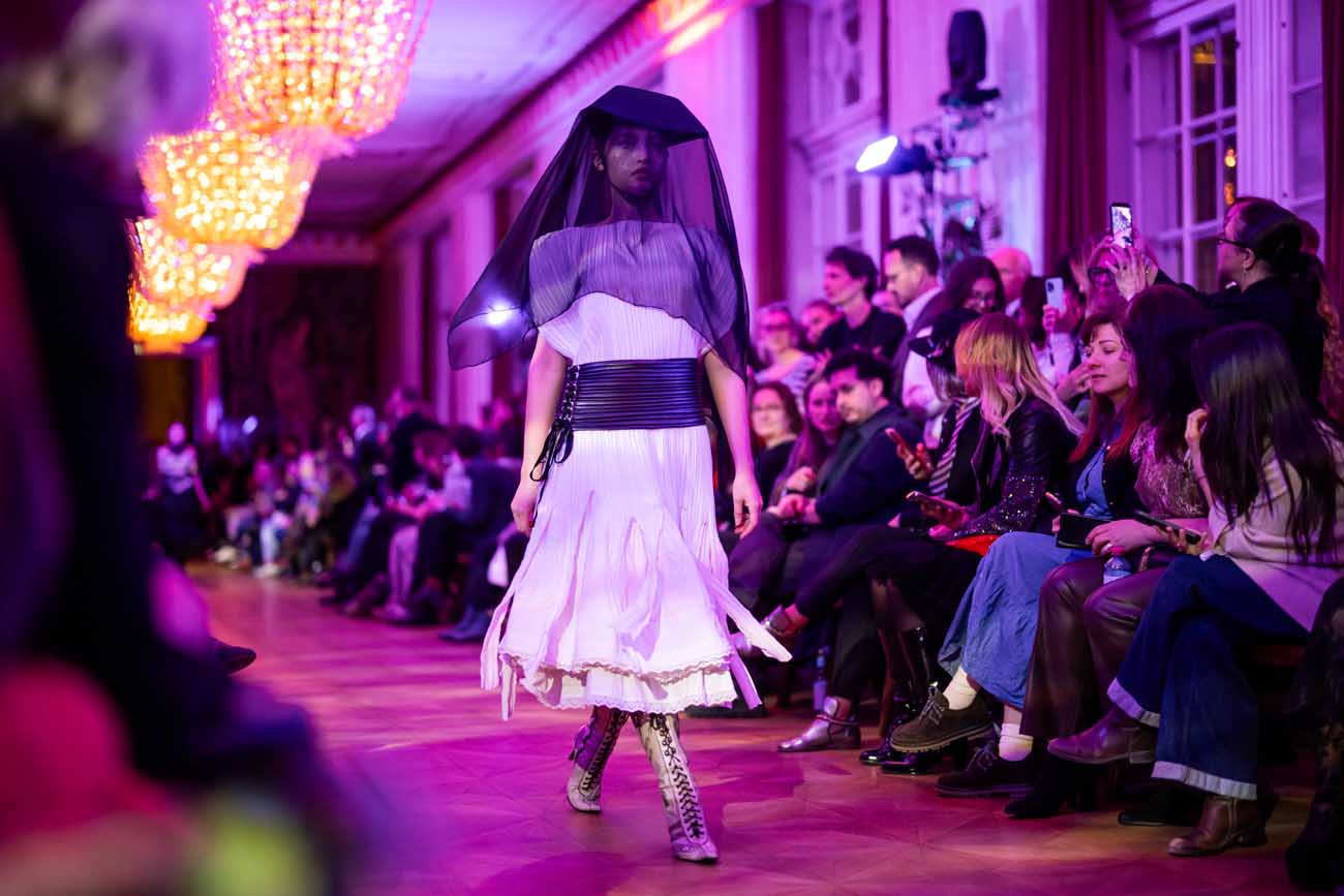 Auf der Feststiege und in den Prunkräumen der Wiener Staatsoper präsentierten 84 junge Designer:innen der KunstModeDesign Herbststrasse ihre eigenen Kollektionen. Die Entwürfe entstanden aus der Auseinandersetzung mit Themen, Musik und Figuren aus Georges Bizets Oper Les Pêcheurs de perles.