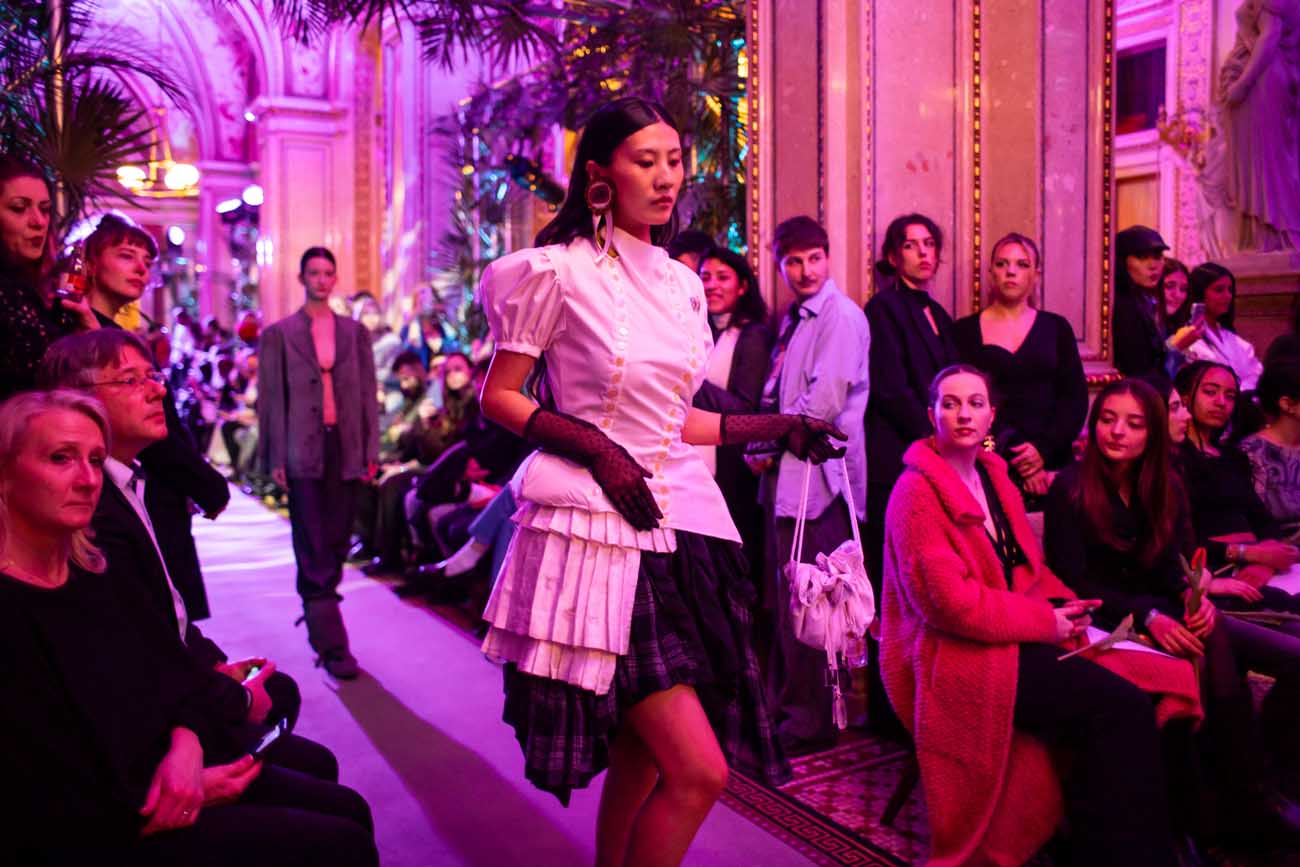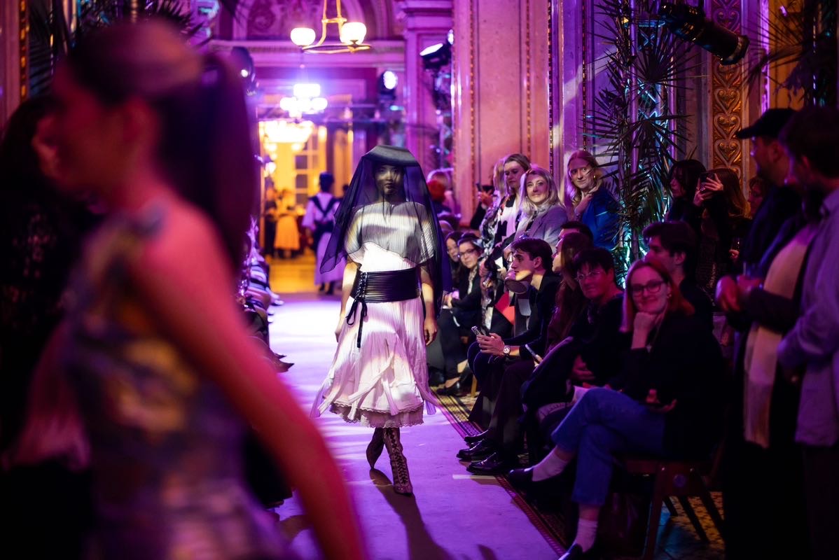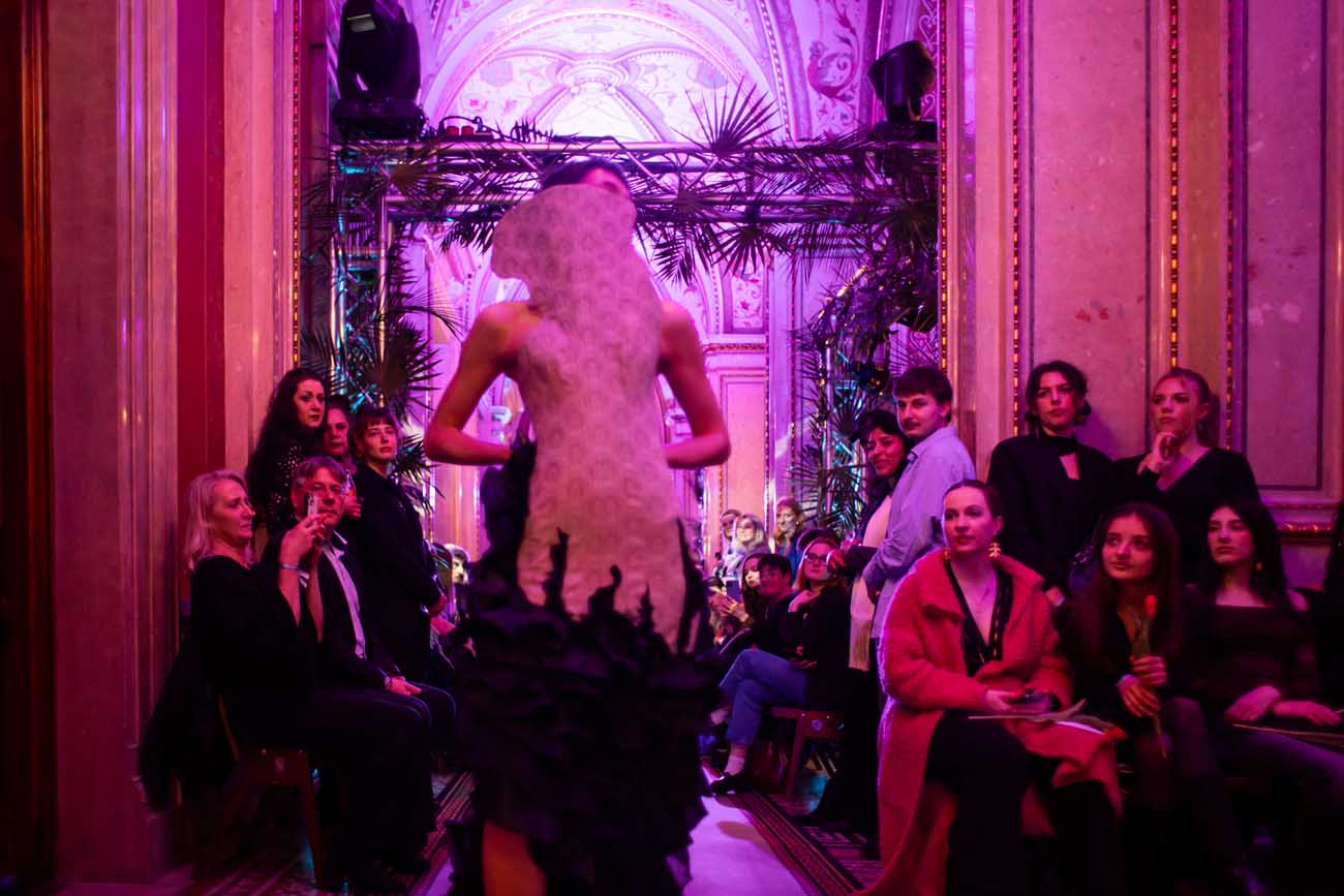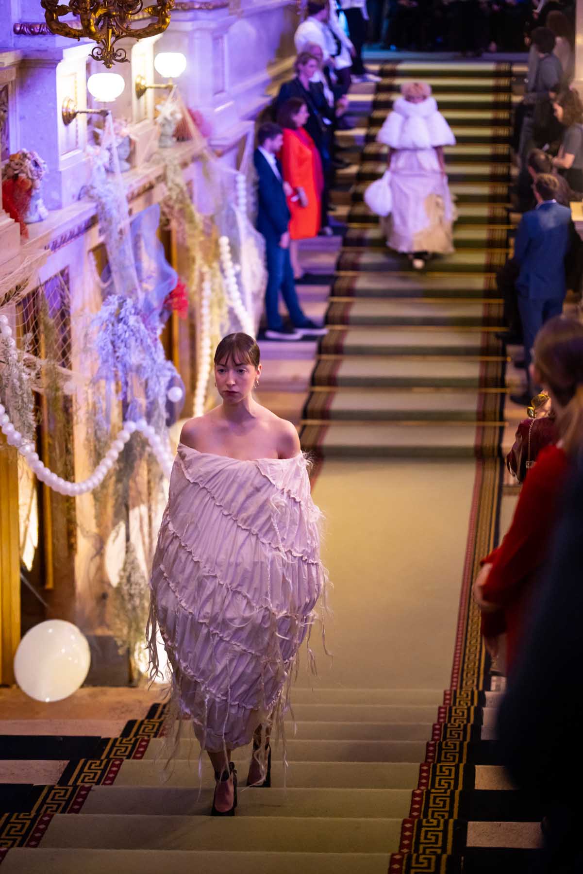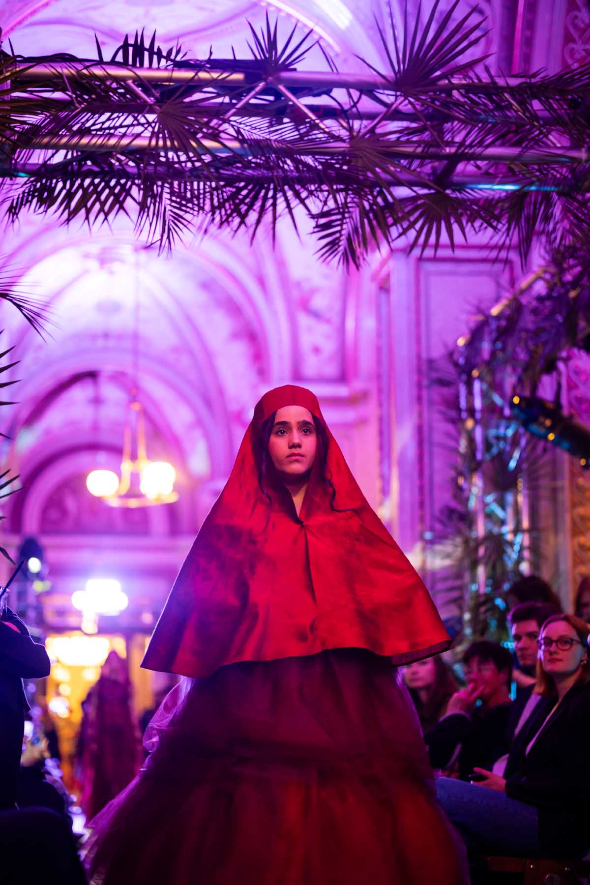 Auf der Feststiege und in den Prunkräumen der Wiener Staatsoper präsentierten 84 junge Designer:innen der KunstModeDesign Herbststrasse ihre eigenen Kollektionen. Die Entwürfe entstanden aus der Auseinandersetzung mit Themen, Musik und Figuren aus Georges Bizets Oper Les Pêcheurs de perles.