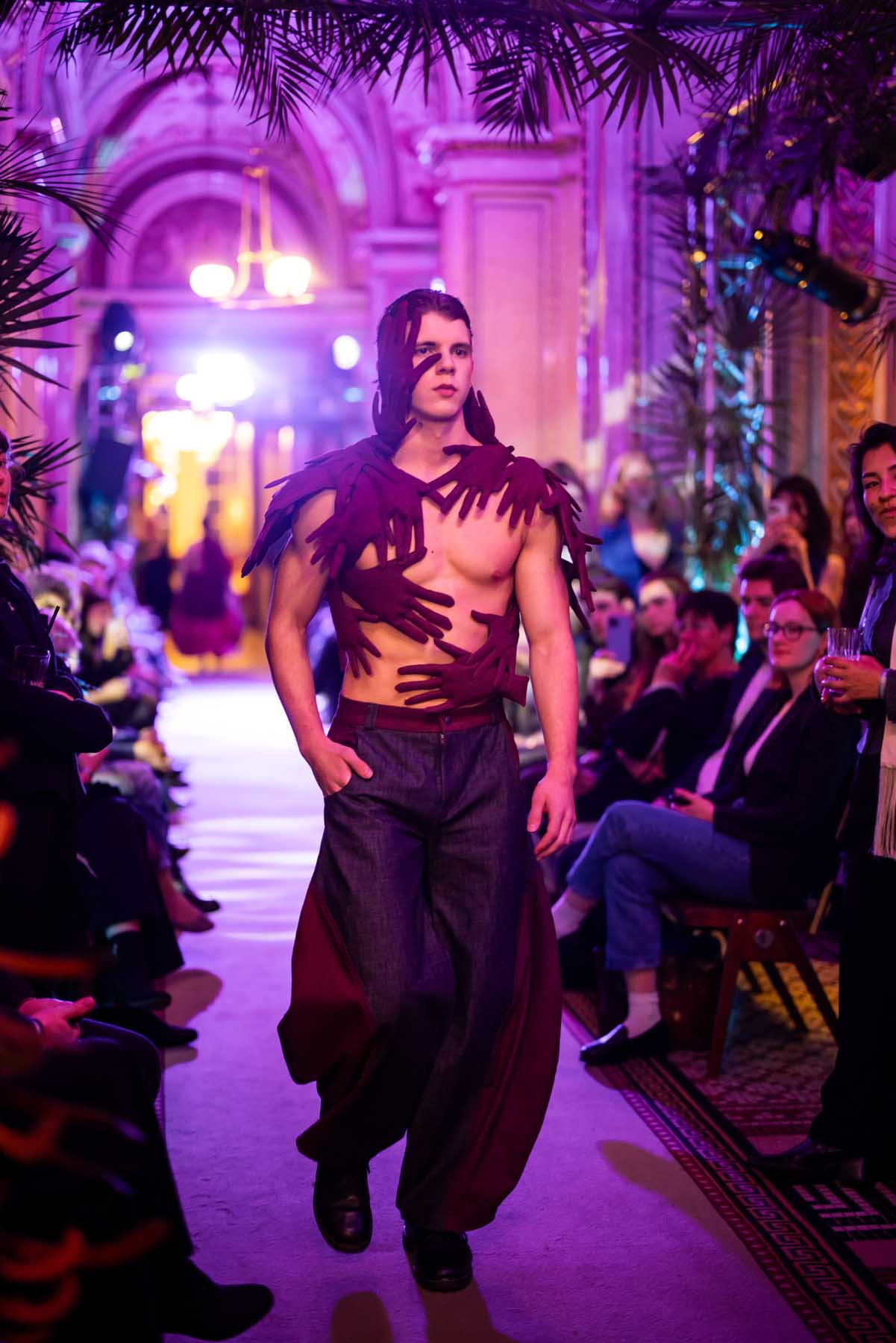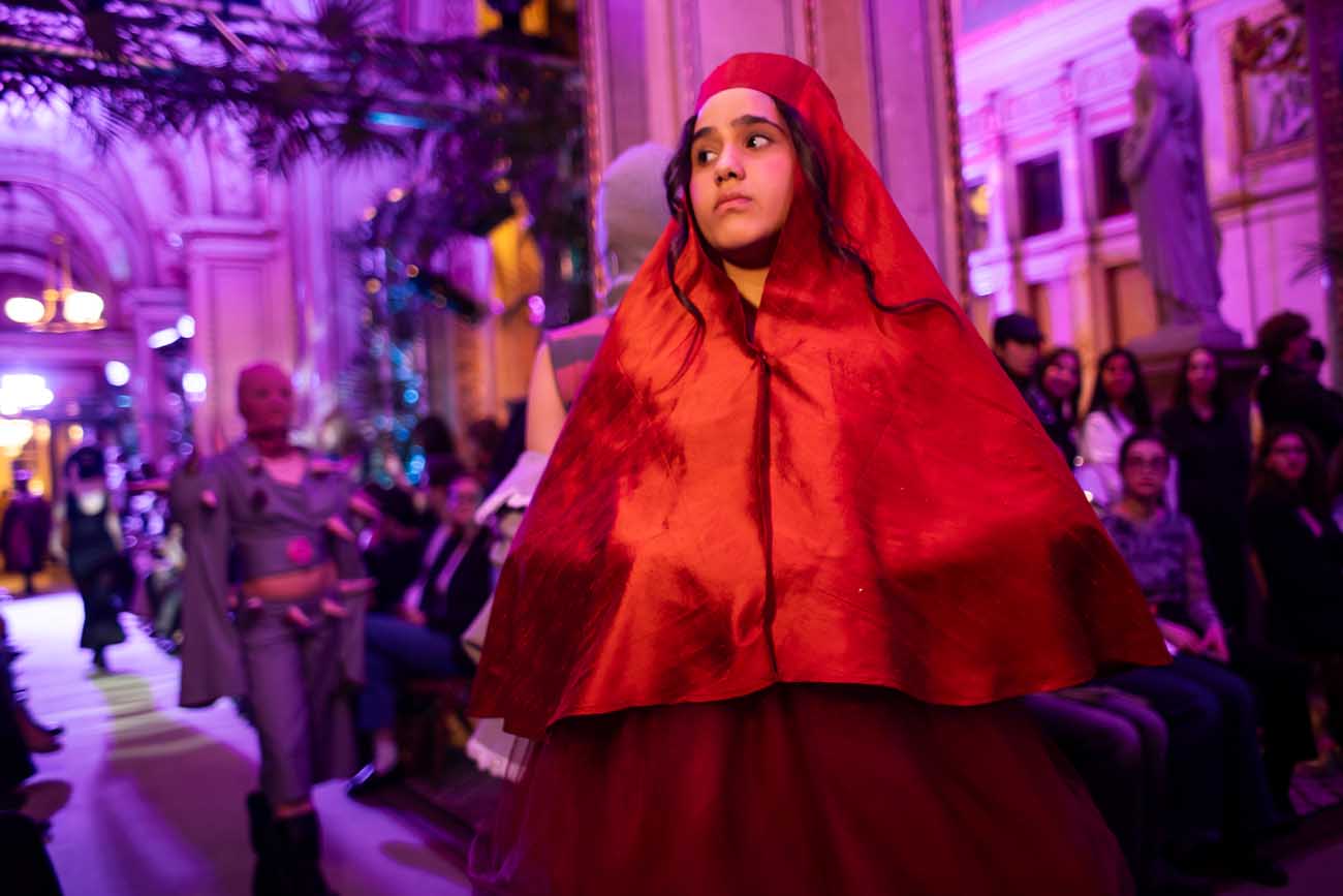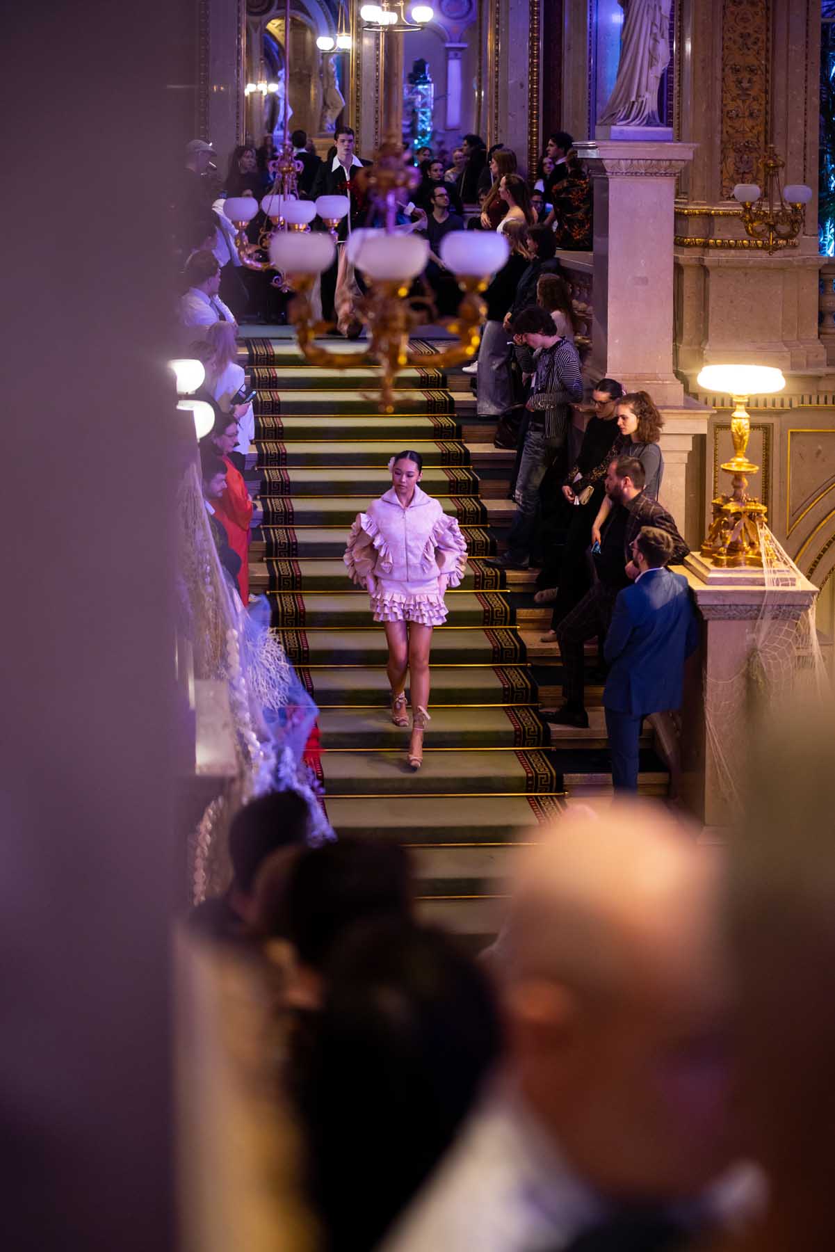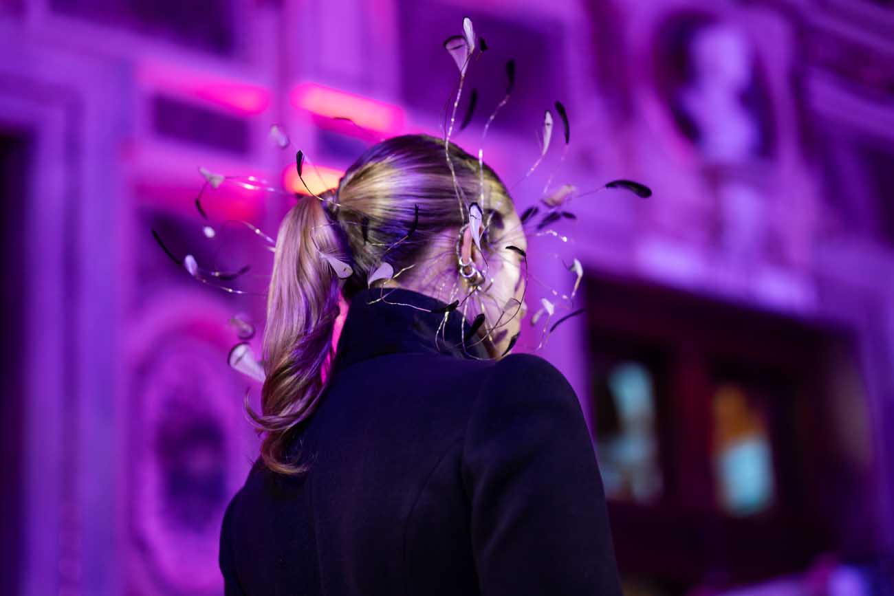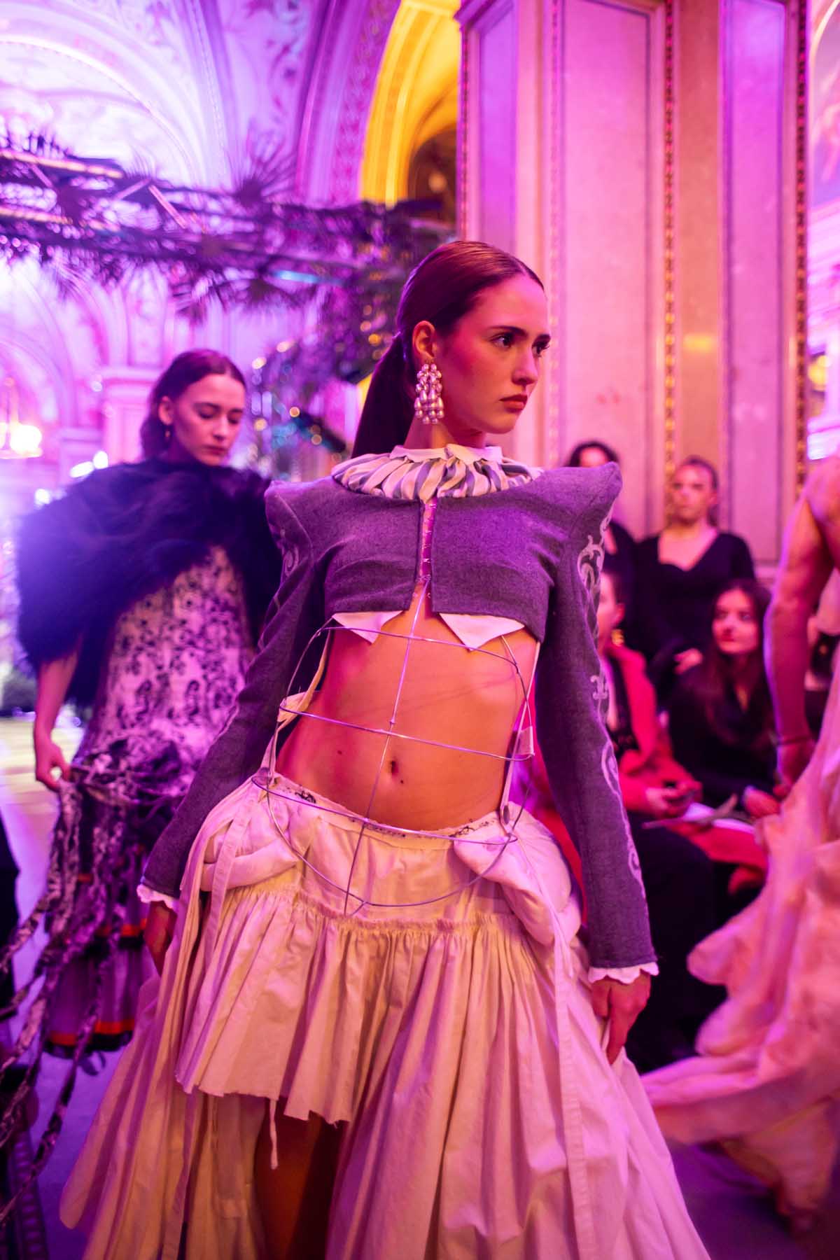 Auf der Feststiege und in den Prunkräumen der Wiener Staatsoper präsentierten 84 junge Designer:innen der KunstModeDesign Herbststrasse ihre eigenen Kollektionen. Die Entwürfe entstanden aus der Auseinandersetzung mit Themen, Musik und Figuren aus Georges Bizets Oper Les Pêcheurs de perles.