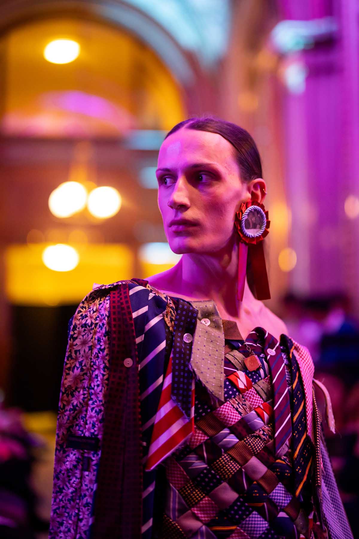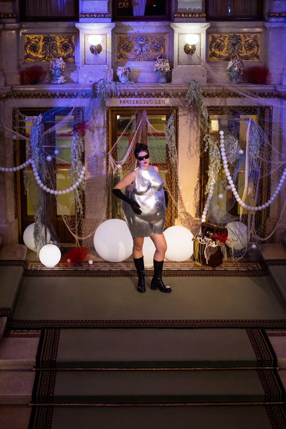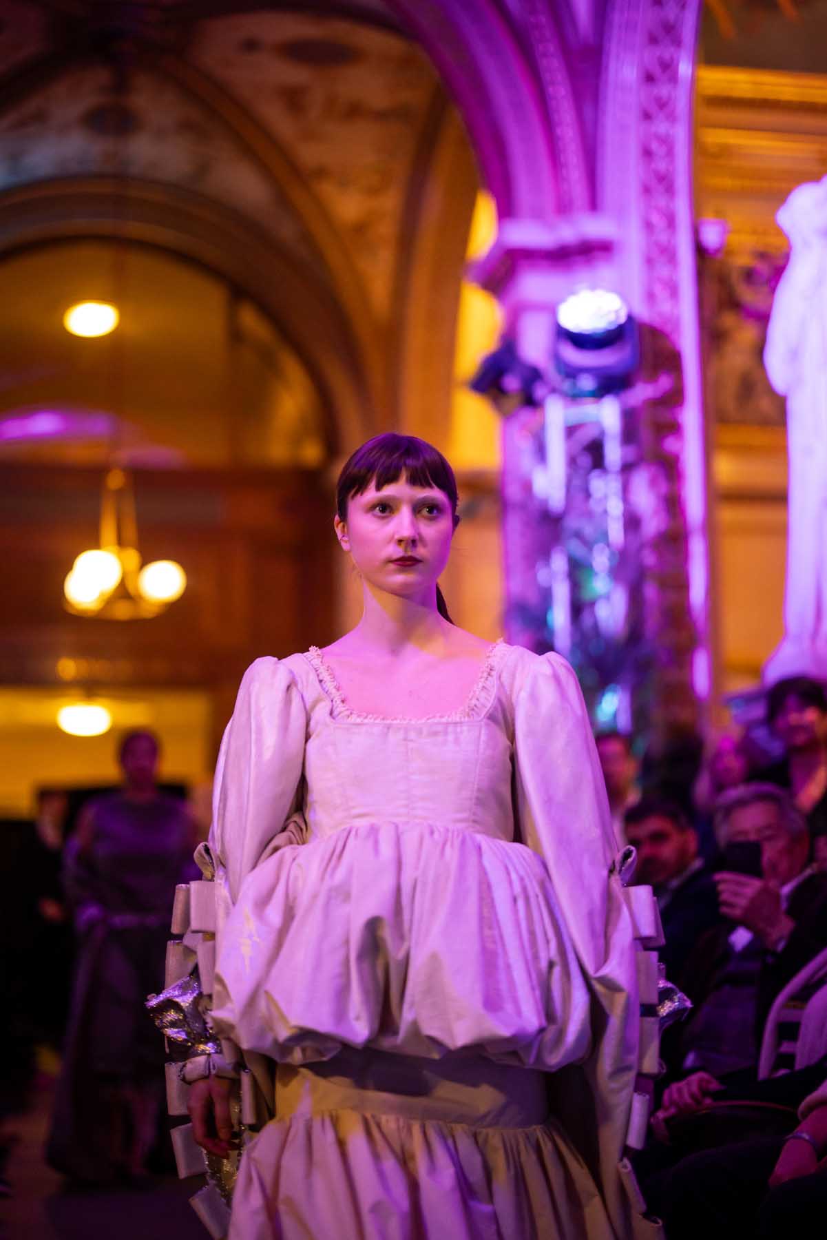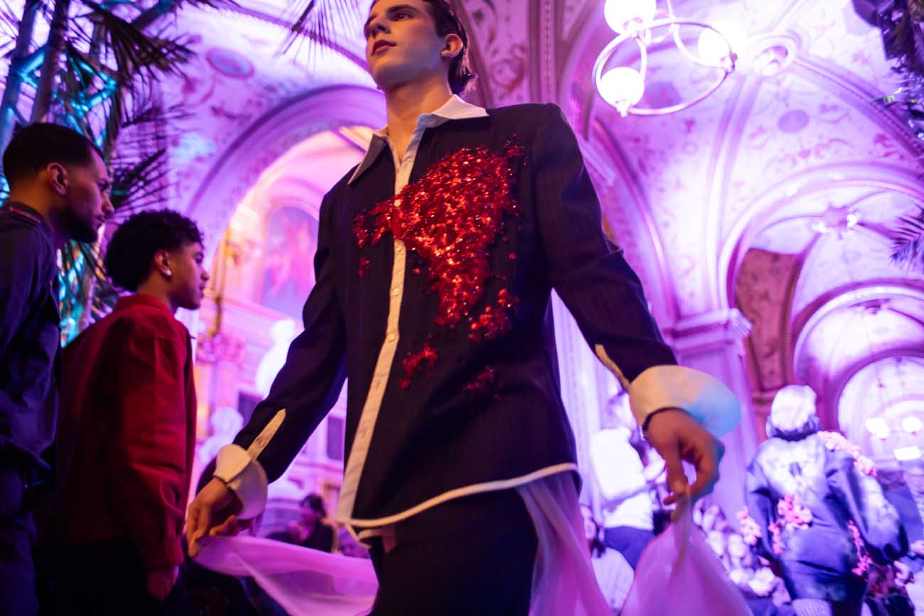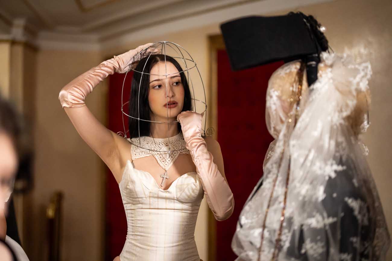 Auf der Feststiege und in den Prunkräumen der Wiener Staatsoper präsentierten 84 junge Designer:innen der KunstModeDesign Herbststrasse ihre eigenen Kollektionen. Die Entwürfe entstanden aus der Auseinandersetzung mit Themen, Musik und Figuren aus Georges Bizets Oper Les Pêcheurs de perles.