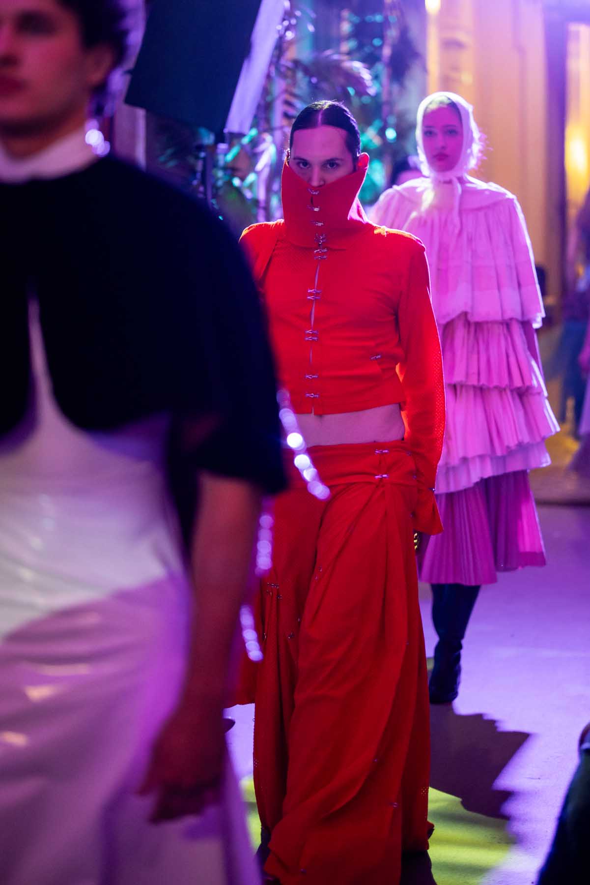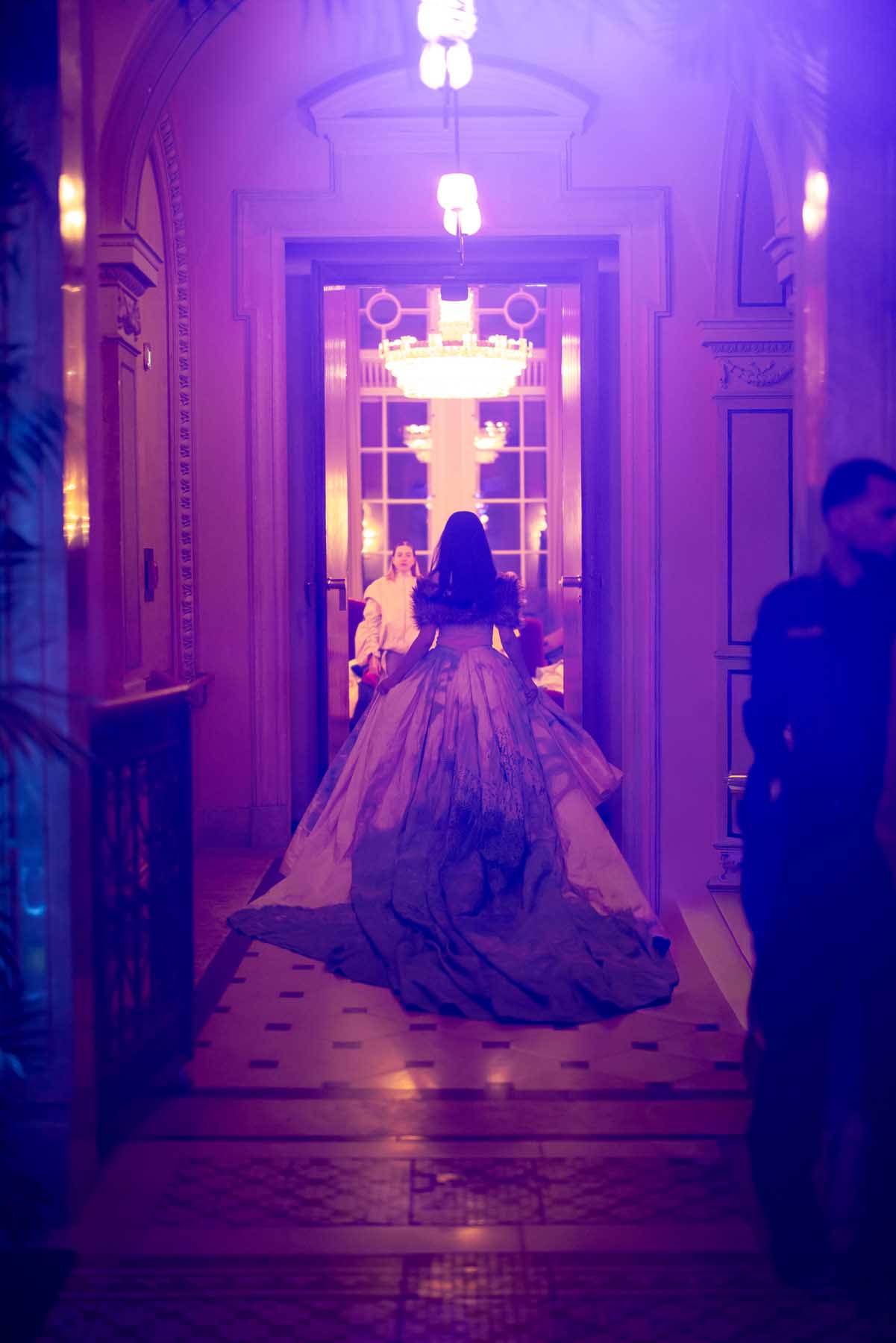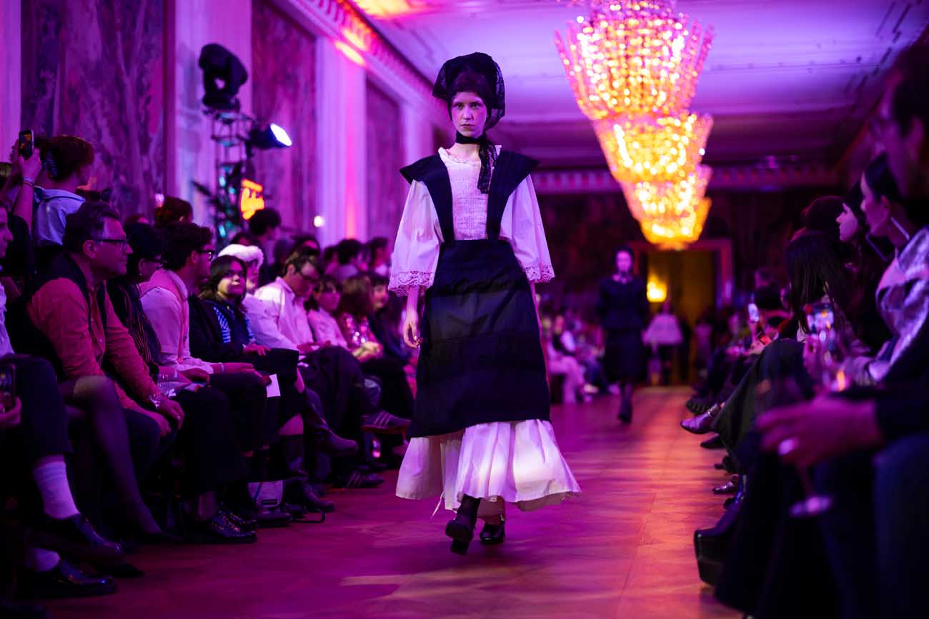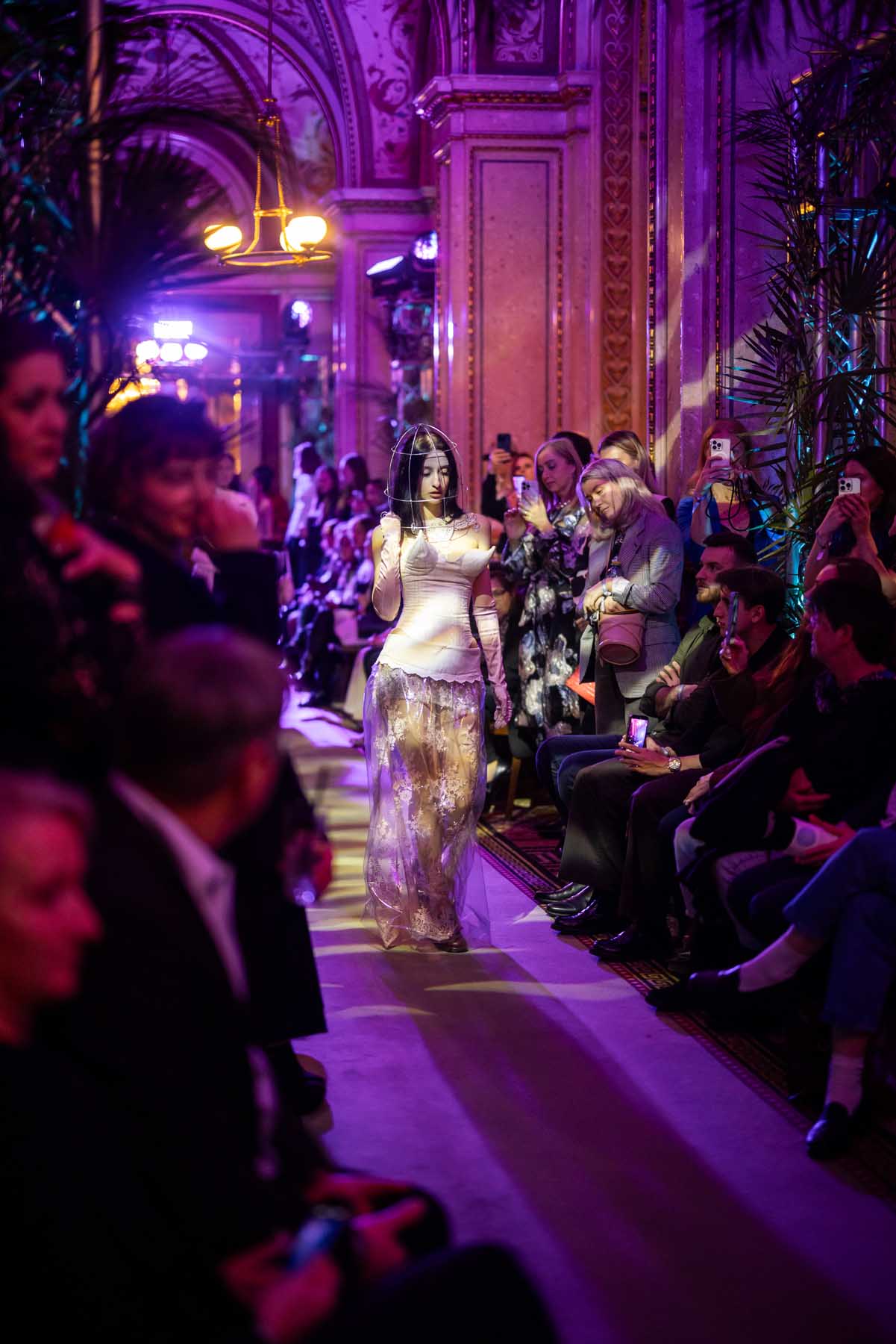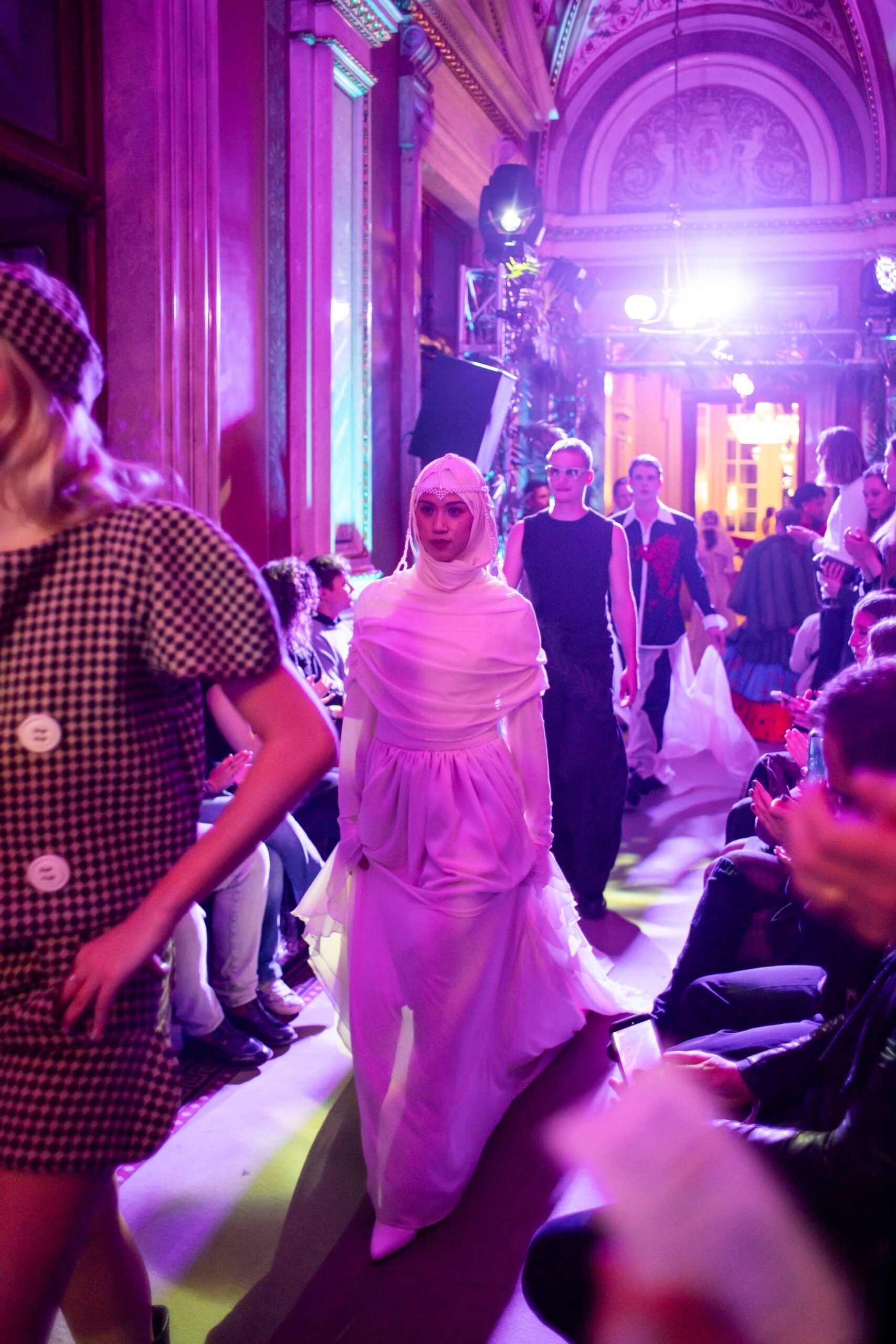 Auf der Feststiege und in den Prunkräumen der Wiener Staatsoper präsentierten 84 junge Designer:innen der KunstModeDesign Herbststrasse ihre eigenen Kollektionen. Die Entwürfe entstanden aus der Auseinandersetzung mit Themen, Musik und Figuren aus Georges Bizets Oper Les Pêcheurs de perles.