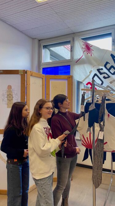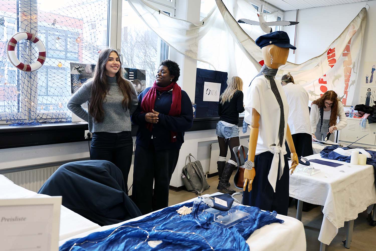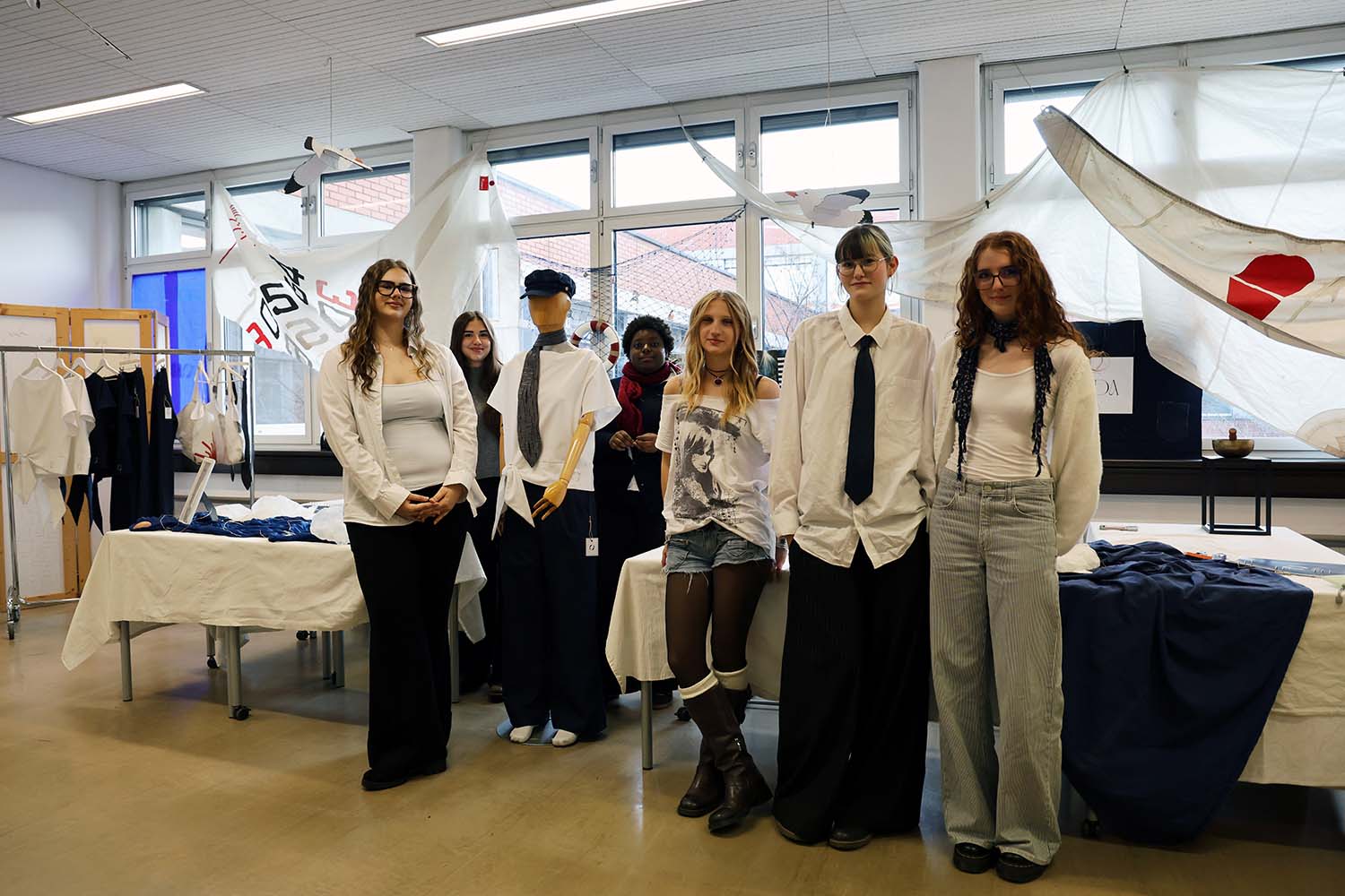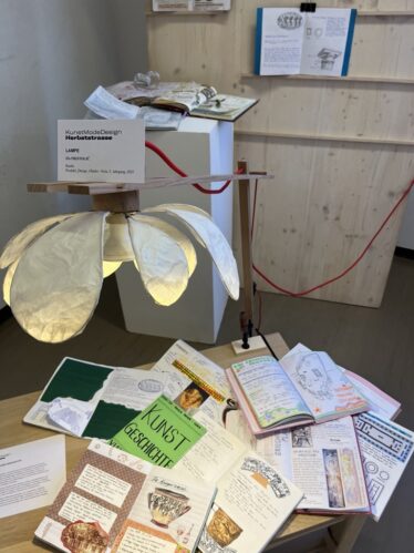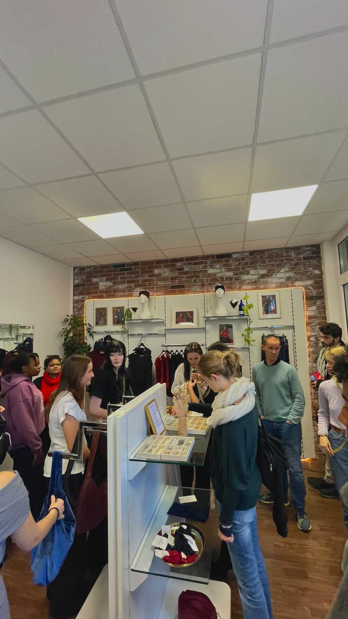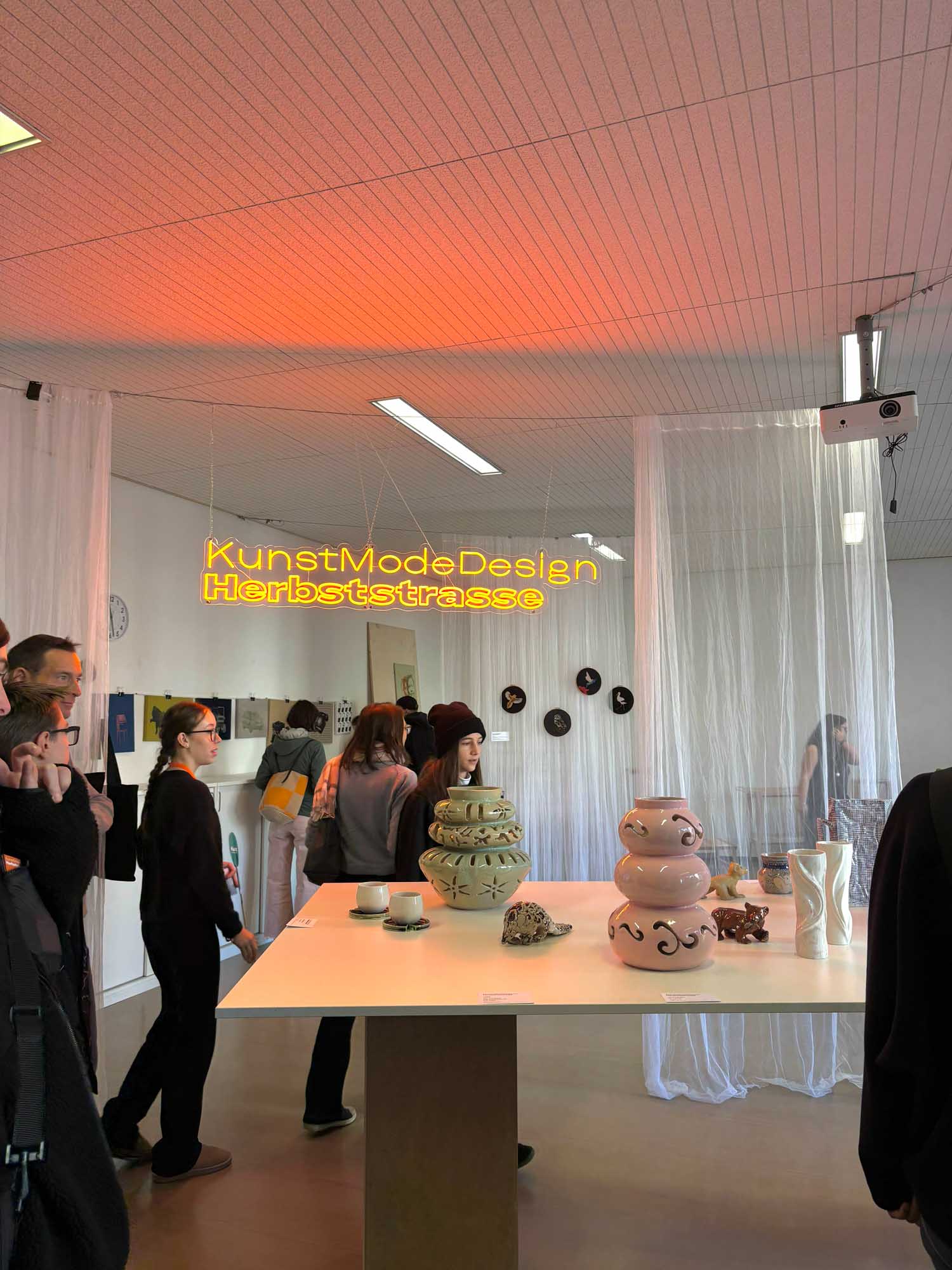 Natürlich hatten wir uns für diesen Tag besonders vorbereitet. Unsere Bildungsberaterin brachte es treffend auf den Punkt („Die KMD hat sich „herausgeputzt!“). Schüler:innen präsentierten aktuelle Arbeitsergebnisse aus Unterricht und Werkstätten: Vitrinen wurden liebevoll mit Kunstobjekten arrangiert und Klassenräume vorübergehend in Ausstellungsflächen verwandelt. Die Junior Companies und der Fachschul-Shop stellten ihre Projekte nicht nur auf Instagram, TikTok & Co vor, sondern präsentierten ihre erste Verkaufskollektion auch direkt vor Ort in eigens eingerichteten Pop-Up Stores. Werbeplakate, Entwurfszeichnungen und künstlerische Arbeiten dekorierten die Wände unserer Kreativschule und gaben einen Eindruck der laufenden Projekte. Bewegt zeigten sich viele Interessierte auch von sehr persönlichen Zugängen der Schüler:innen und Schüler in diversen Designkonzepten der Abschlussjahrgänge.