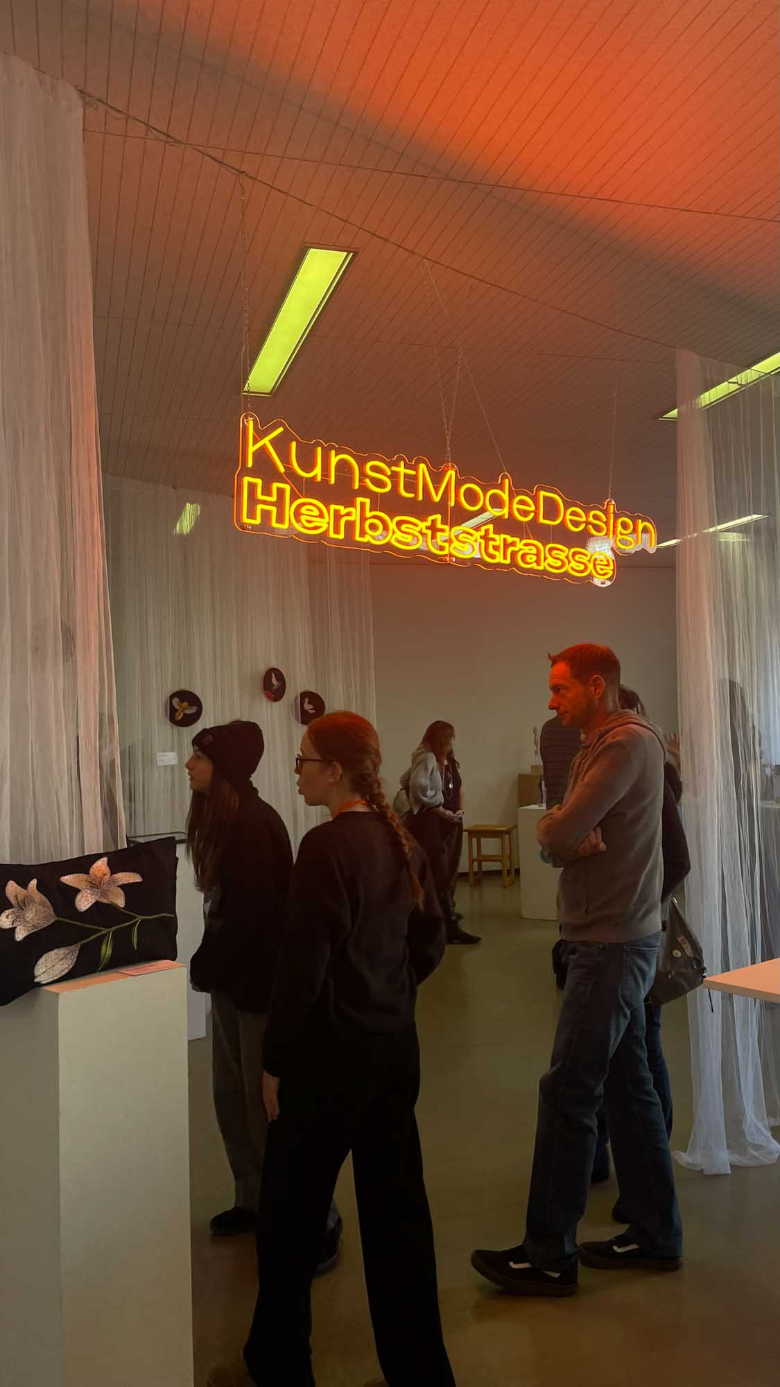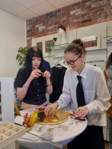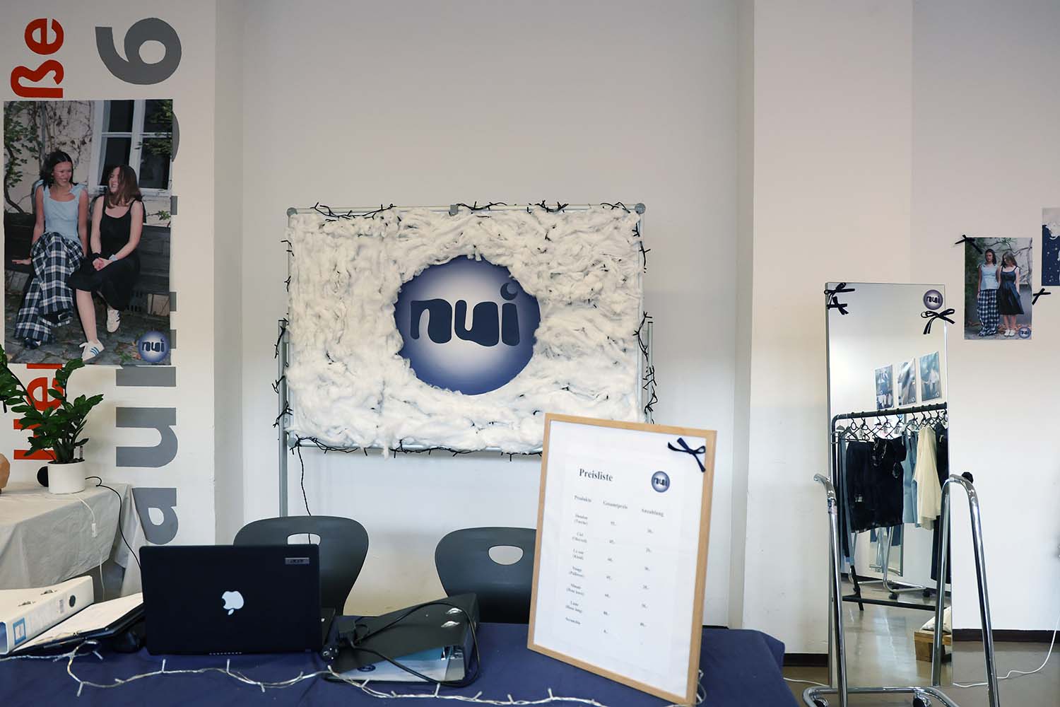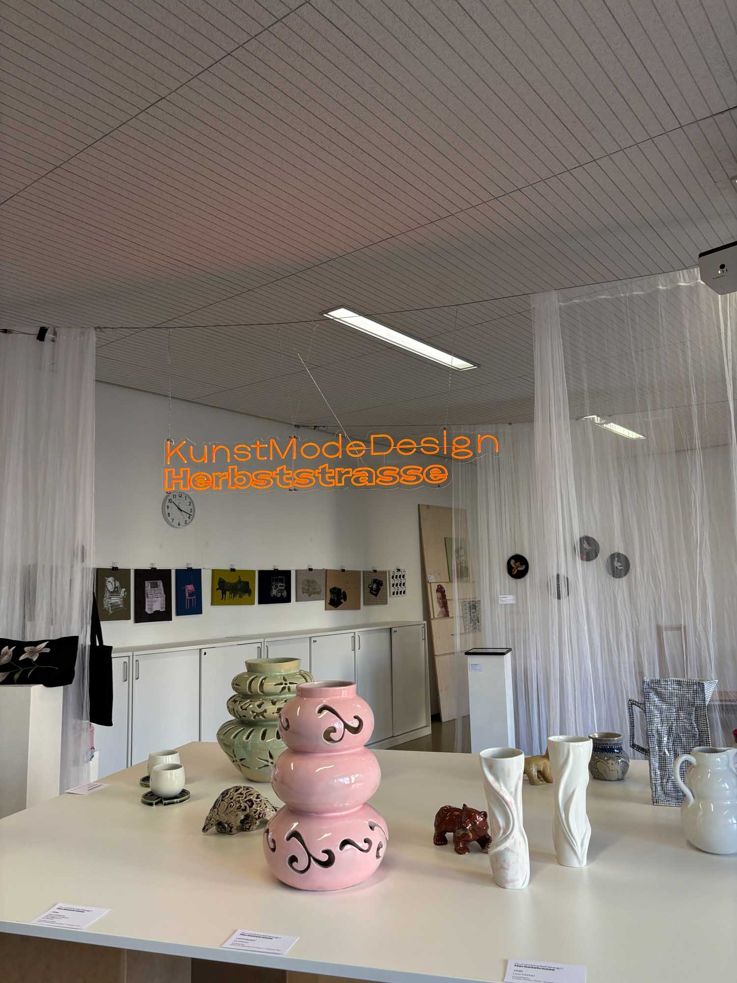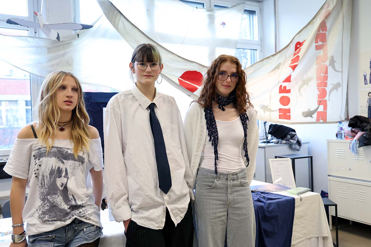 Natürlich hatten wir uns für diesen Tag besonders vorbereitet. Unsere Bildungsberaterin brachte es treffend auf den Punkt („Die KMD hat sich „herausgeputzt!“). Schüler:innen präsentierten aktuelle Arbeitsergebnisse aus Unterricht und Werkstätten: Vitrinen wurden liebevoll mit Kunstobjekten arrangiert und Klassenräume vorübergehend in Ausstellungsflächen verwandelt. Die Junior Companies und der Fachschul-Shop stellten ihre Projekte nicht nur auf Instagram, TikTok & Co vor, sondern präsentierten ihre erste Verkaufskollektion auch direkt vor Ort in eigens eingerichteten Pop-Up Stores. Werbeplakate, Entwurfszeichnungen und künstlerische Arbeiten dekorierten die Wände unserer Kreativschule und gaben einen Eindruck der laufenden Projekte. Bewegt zeigten sich viele Interessierte auch von sehr persönlichen Zugängen der Schüler:innen und Schüler in diversen Designkonzepten der Abschlussjahrgänge.