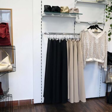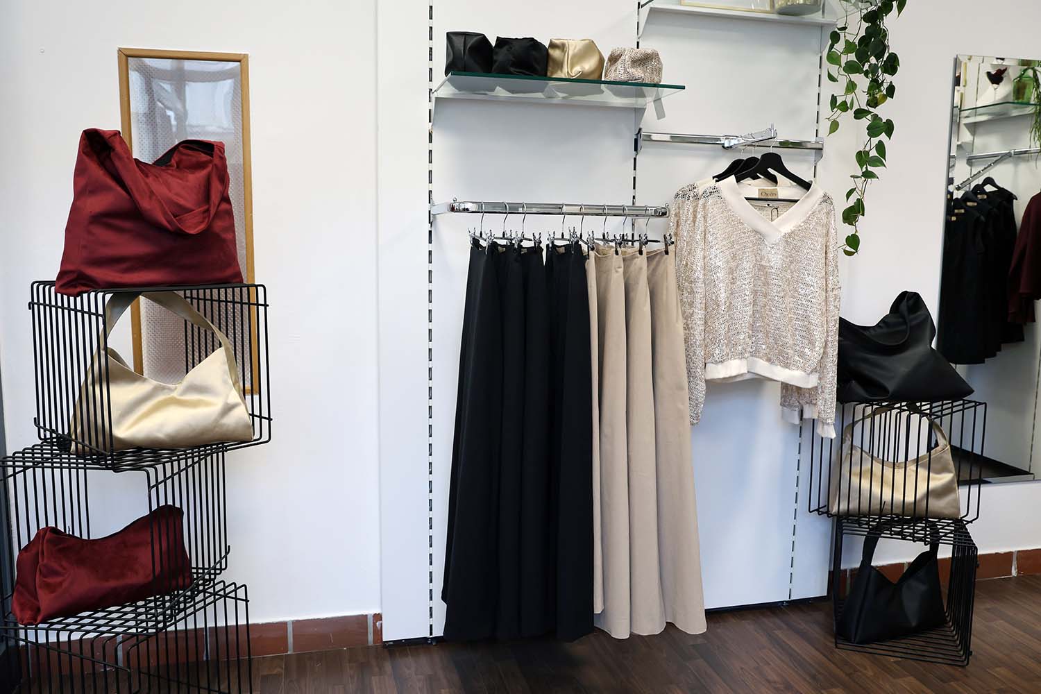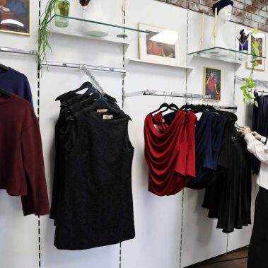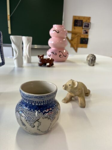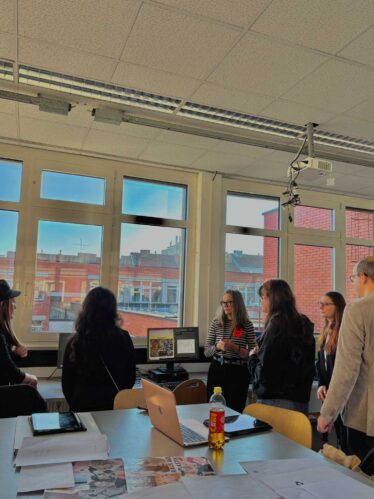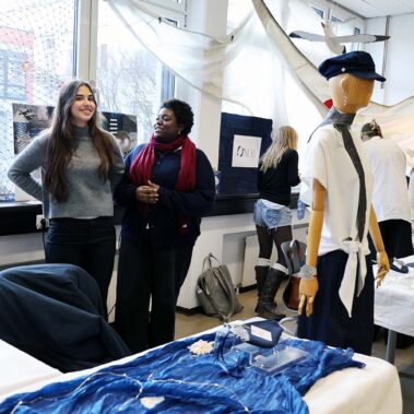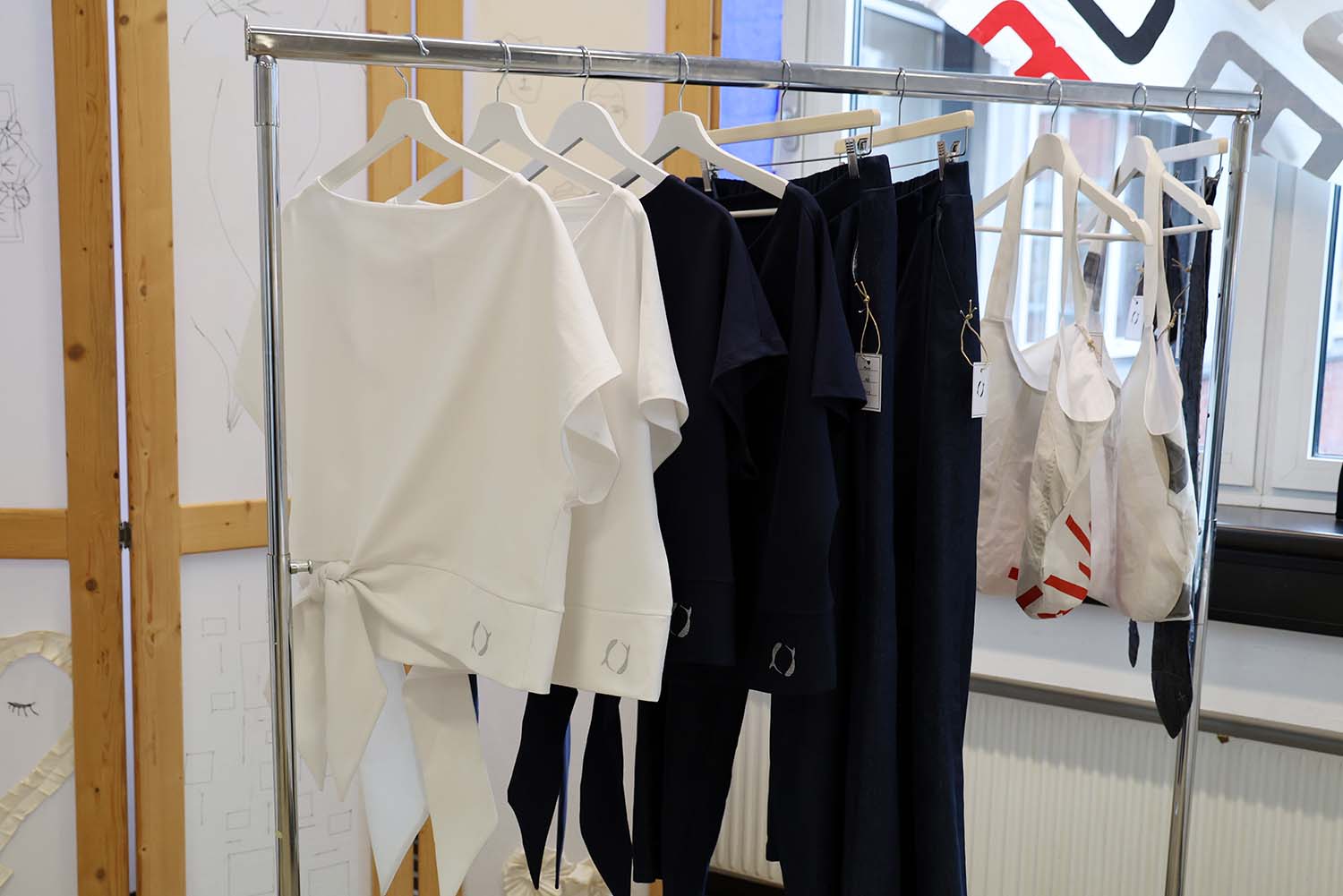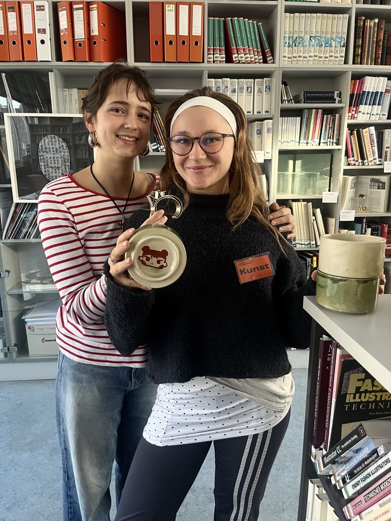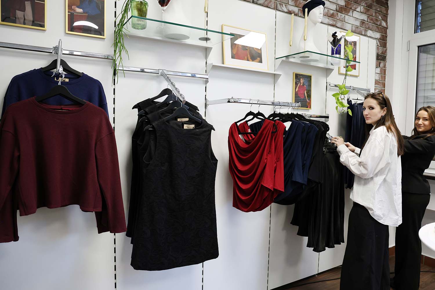 Natürlich hatten wir uns für diesen Tag besonders vorbereitet. Unsere Bildungsberaterin brachte es treffend auf den Punkt („Die KMD hat sich „herausgeputzt!“). Schüler:innen präsentierten aktuelle Arbeitsergebnisse aus Unterricht und Werkstätten: Vitrinen wurden liebevoll mit Kunstobjekten arrangiert und Klassenräume vorübergehend in Ausstellungsflächen verwandelt. Die Junior Companies und der Fachschul-Shop stellten ihre Projekte nicht nur auf Instagram, TikTok & Co vor, sondern präsentierten ihre erste Verkaufskollektion auch direkt vor Ort in eigens eingerichteten Pop-Up Stores. Werbeplakate, Entwurfszeichnungen und künstlerische Arbeiten dekorierten die Wände unserer Kreativschule und gaben einen Eindruck der laufenden Projekte. Bewegt zeigten sich viele Interessierte auch von sehr persönlichen Zugängen der Schüler:innen und Schüler in diversen Designkonzepten der Abschlussjahrgänge.