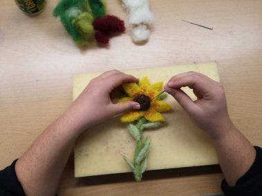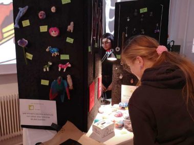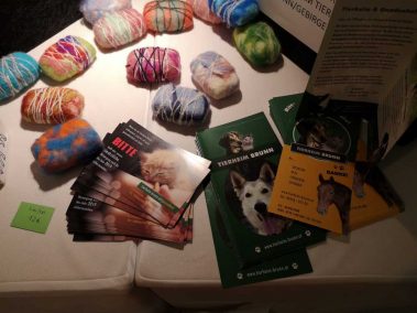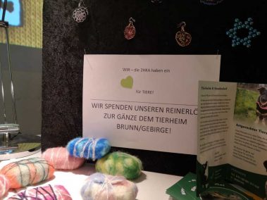 Bei der Arbeit des Filzens hat sich der 2. Jahrgang der Kunstschule überlegt, wer mit dem Erlös des Standes beim Weihnachtsmarkt der Herbststrasse dieses Jahr unterstützt werden soll. Die Schüler/innen haben sich auf das Tierheim Brunn am Gebirge verständigt. Dadurch entstand dann schließlich auch die Idee, Tiere aus Filz zu produzieren, welche schlussendlich bei den Besucher/innen des Weihnachtsmarktes auch sehr gut angekommen sind. Ergänzend zu diesen Produkten haben die Jugendlichen auch Schmuck, Taschen und Seifen im Filzmantel angeboten. Am Ende ergab sich ein Erlös in der Höhe von 671,30 € – diese Summe wurde dem Tierheim gespendet.