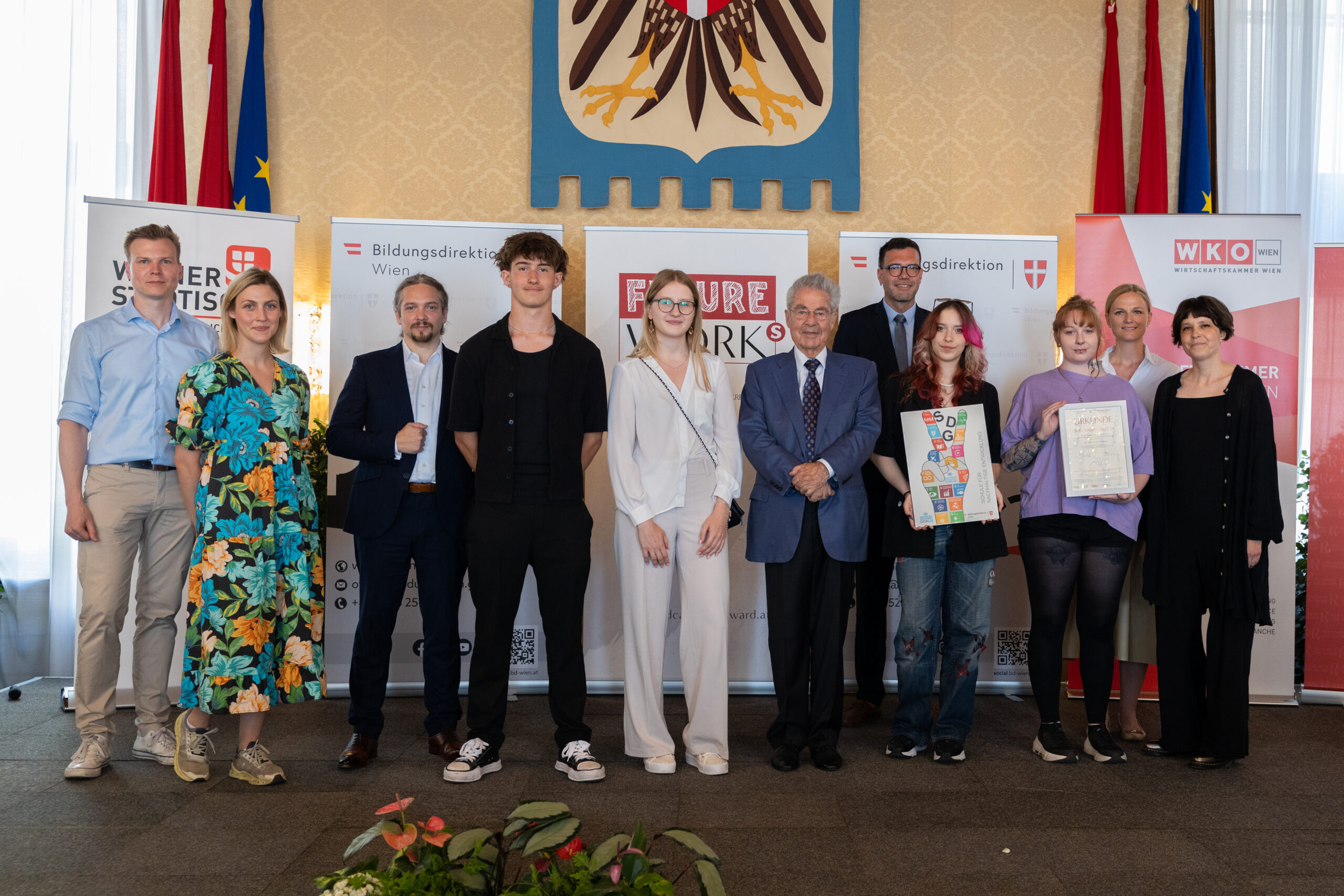 28 Wiener Schulen haben mitgemacht und gestern fand die feierliche Ehrung der sechs Gewinner-Schulen im Wappensaal des Wiener Rathauses statt. Mit dabei waren gemeinsam mit Bildungsdirektor Heinrich Himmer, Heinz Fischer, ehemaliger Bundespräsidenten und Co-Vorsitzenden des Ban Ki-moon Center for Global Citizen sowie Monika Froehler, Geschäftsführerin des Ban Ki-moon Center for Global Citizen und Manuel Gras, Obmann und Gründer von Futureworks mit Projektleiterin Victoria Alice Kanzian (redcarpetartaward).