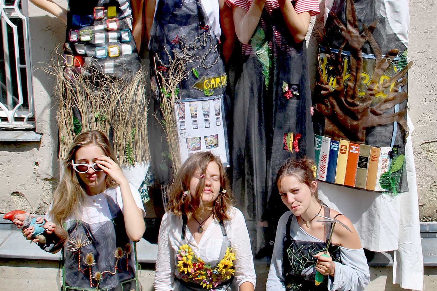 Der 2. Jahrgang der Kunstschule Herbststrasse fotografiert, stickt, klebt und näht die urbane Wildnis auf eine „Gartenschürze“!