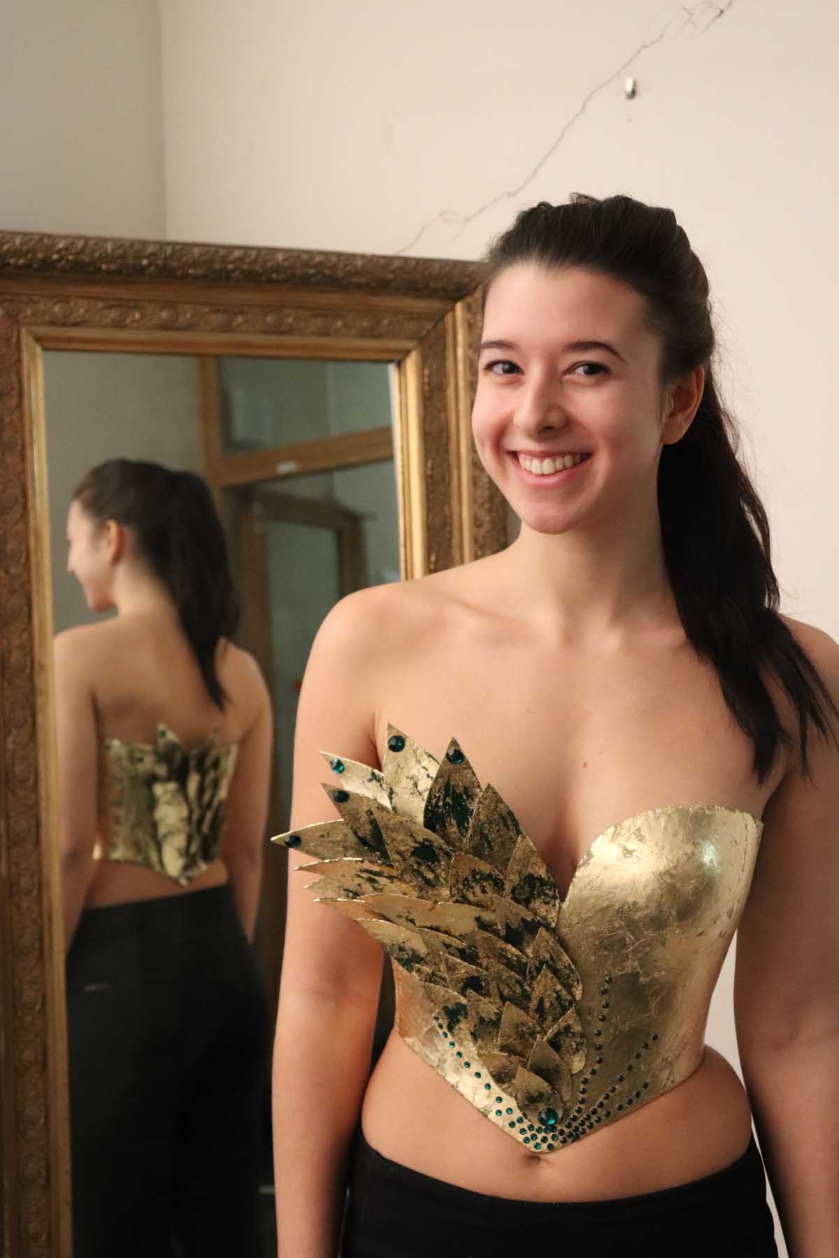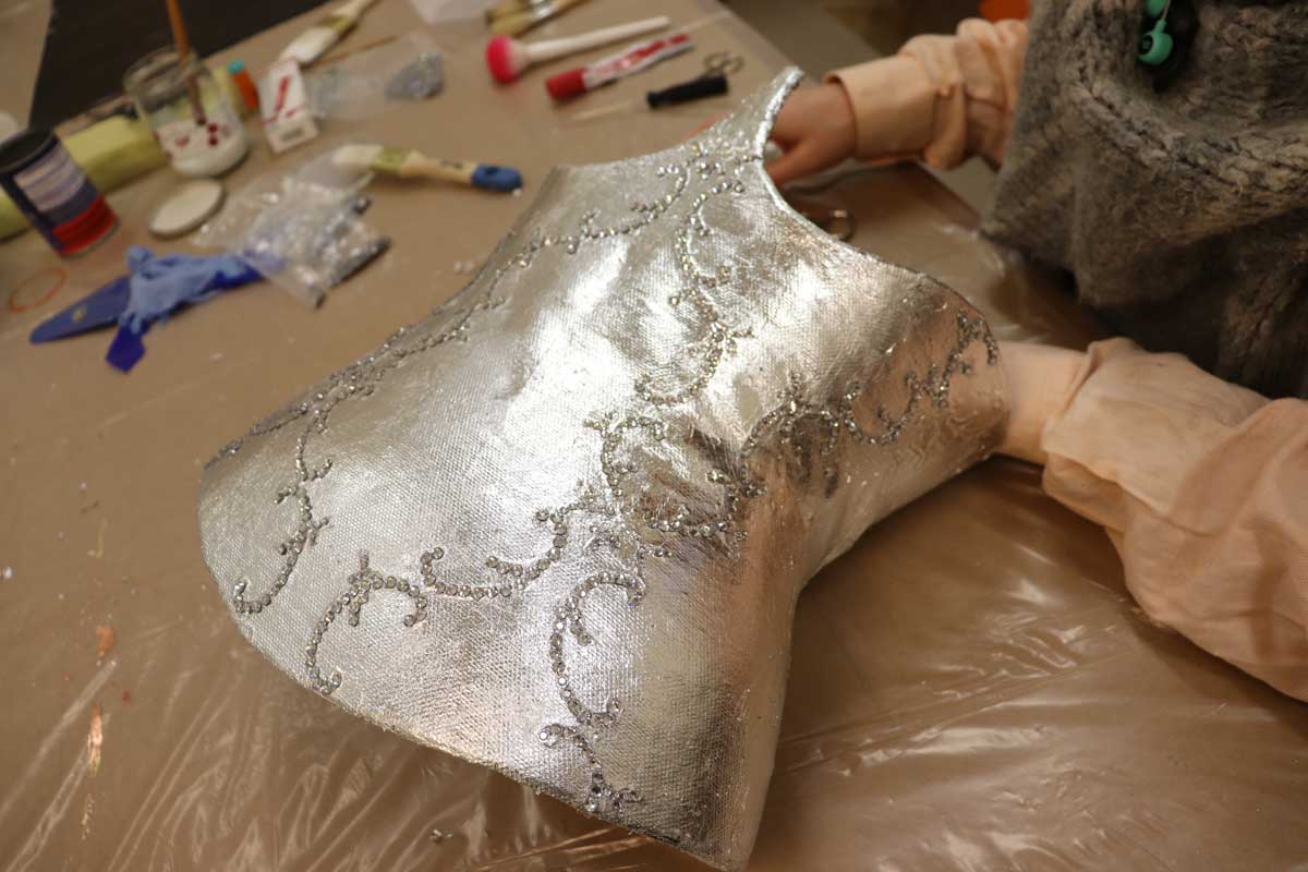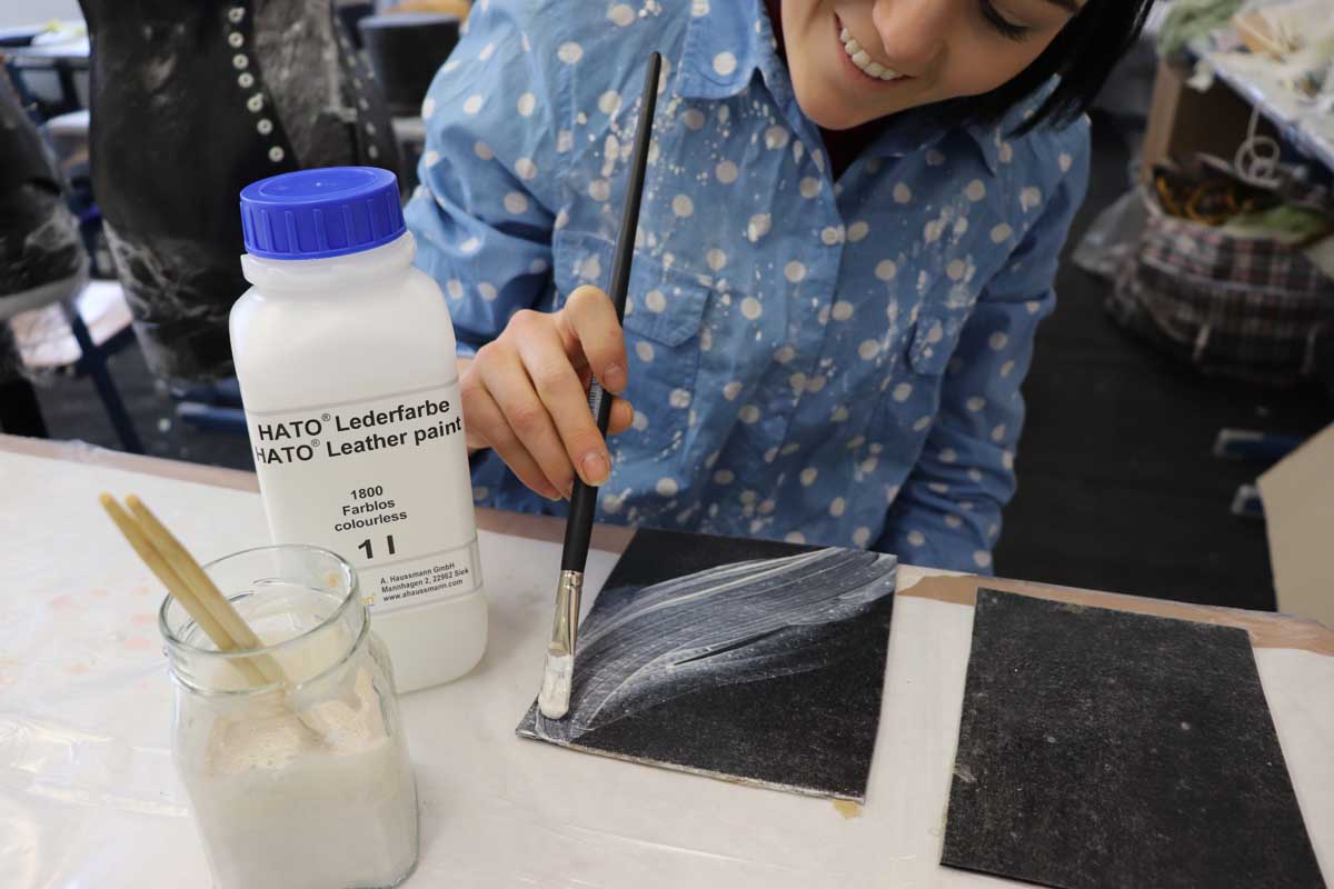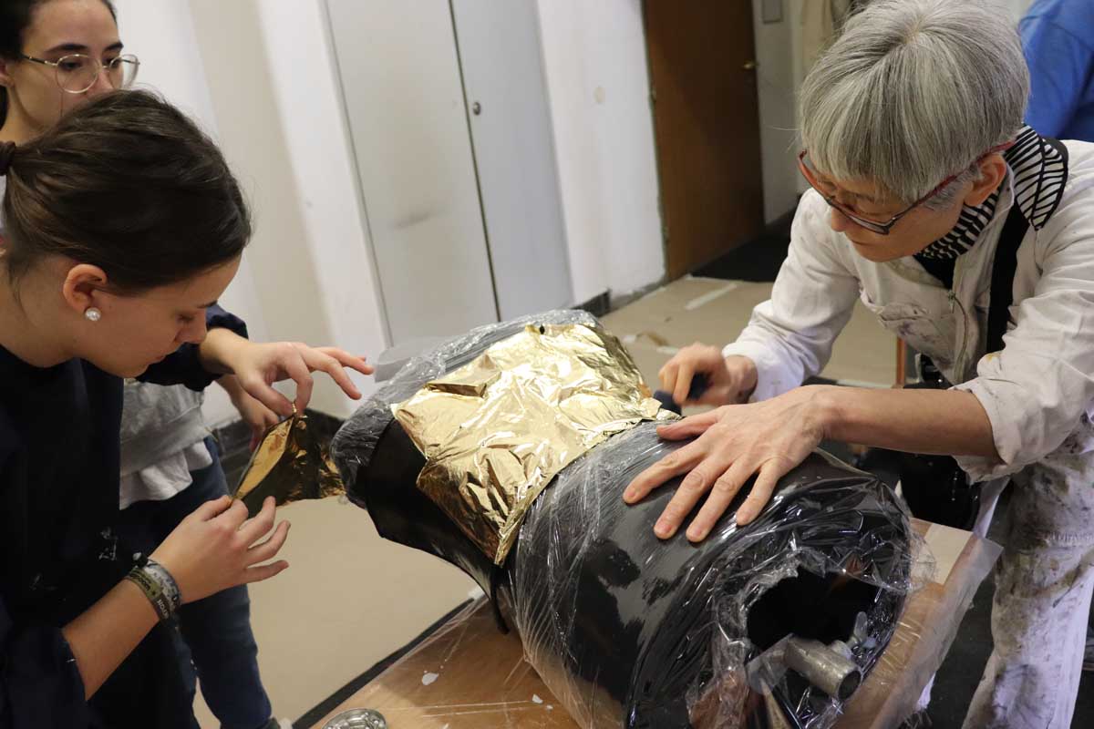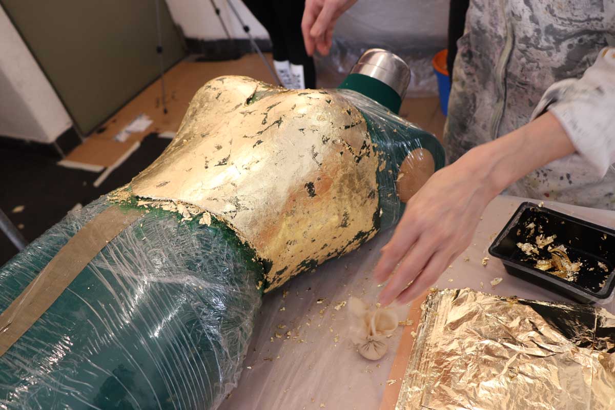 Die Schüler/innen der Meisterklasse für Bühnenkostüm an der KunstModeDesign Herbststrasse haben an einem viertägigen Kostümmalerei-Workshop, unter der Leitung der renommierten Kostümmalerin Frau Kaname Kiyono, teilgenommen. Der Schwerpunkt des Workshops wurde im Bereich Vergolden und Metallisieren mithilfe von Schlagmetall, Pigmentfarben und Metallfolien gesetzt, wobei einige Teilnehmerinnen aber auch andere Methoden der Oberflächenbearbeitung, wie die Reißlacktechnik, anwendeten, um die gewünschten Effekte zu erzielen. Den vergoldeten Werkstücken wurde unter Anleitung von Frau Kiyono u.a. durch Schattierung oder Patinierung der letzte Schliff verliehen. Das großzügige Sponsoring der hochwertigsten Arbeitsmaterialien durch die Firmen