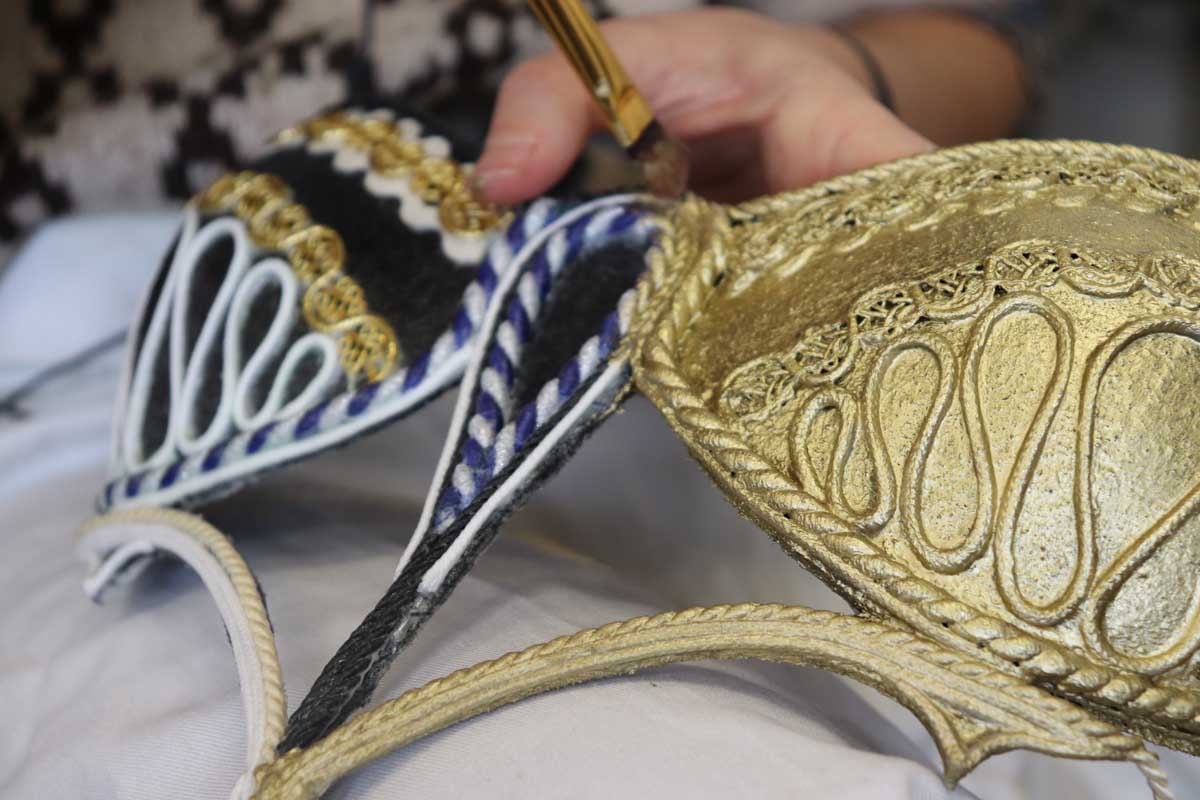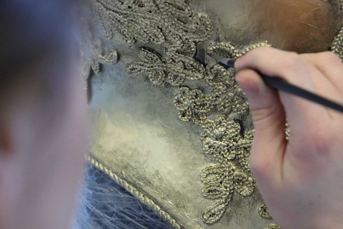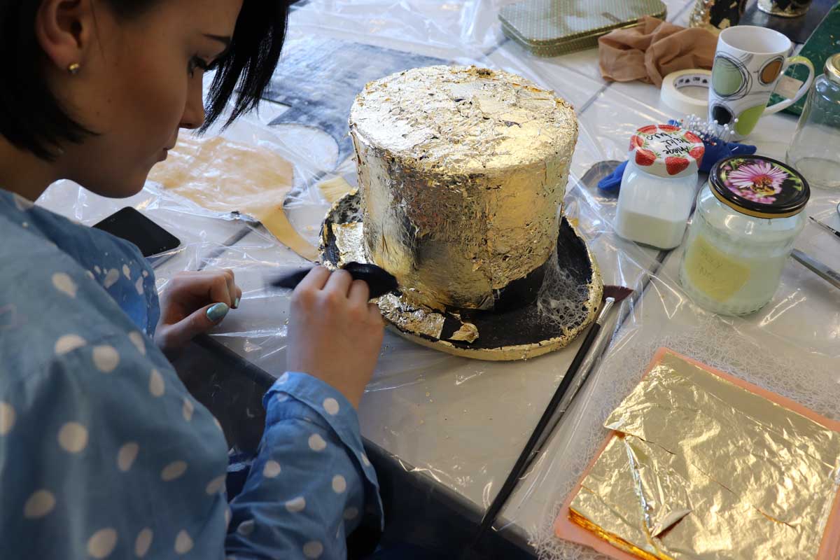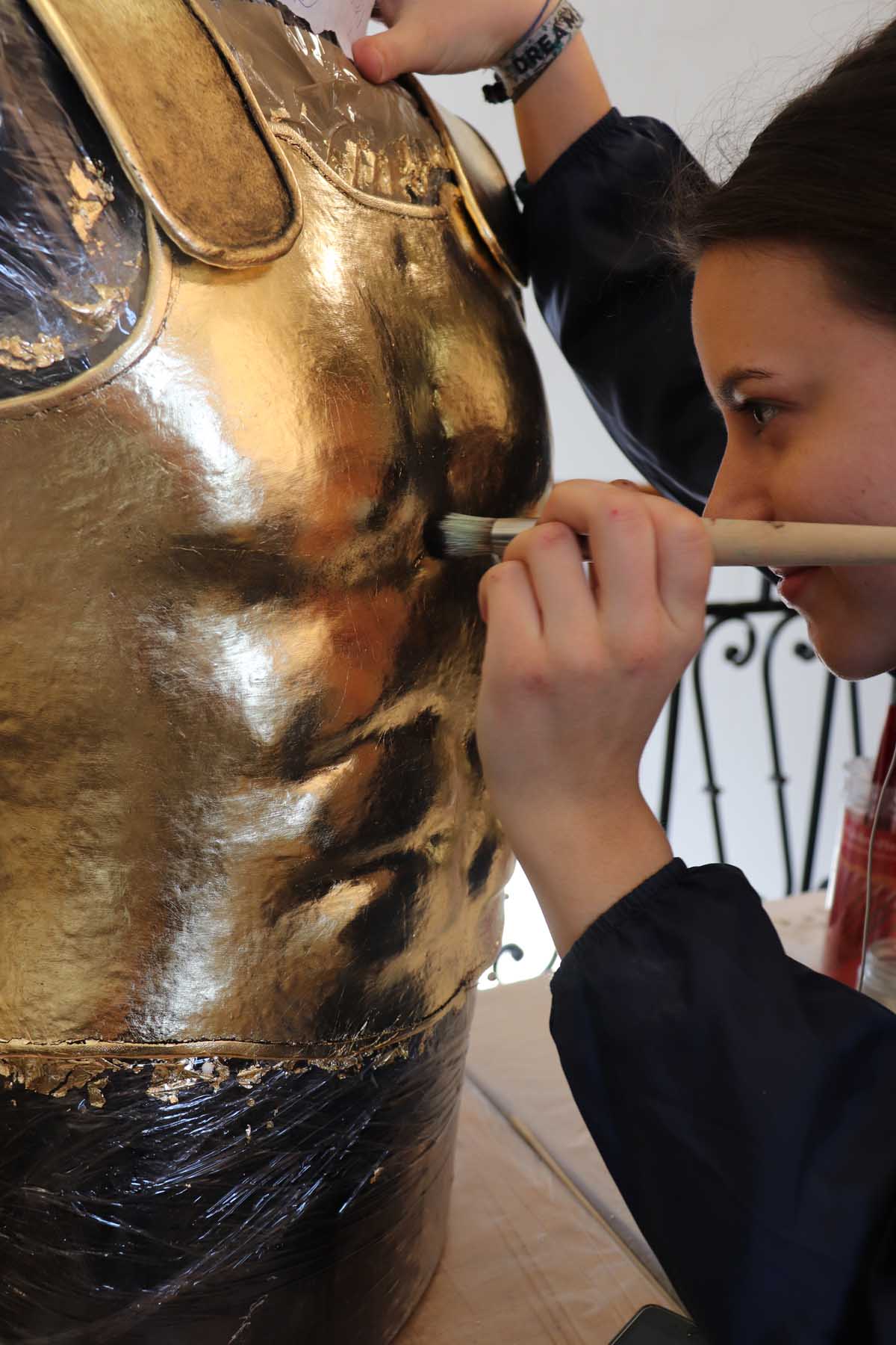 Die Schüler/innen der Meisterklasse für Bühnenkostüm an der KunstModeDesign Herbststrasse haben an einem viertägigen Kostümmalerei-Workshop, unter der Leitung der renommierten Kostümmalerin Frau Kaname Kiyono, teilgenommen. Der Schwerpunkt des Workshops wurde im Bereich Vergolden und Metallisieren mithilfe von Schlagmetall, Pigmentfarben und Metallfolien gesetzt, wobei einige Teilnehmerinnen aber auch andere Methoden der Oberflächenbearbeitung, wie die Reißlacktechnik, anwendeten, um die gewünschten Effekte zu erzielen. Den vergoldeten Werkstücken wurde unter Anleitung von Frau Kiyono u.a. durch Schattierung oder Patinierung der letzte Schliff verliehen. Das großzügige Sponsoring der hochwertigsten Arbeitsmaterialien durch die Firmen
