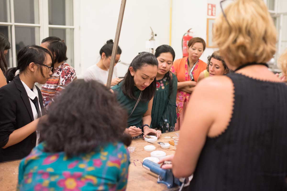 Nach einer köstlichen indonesischen Verpflegung konnte bei einem quirligen Workshop eine Schmucktechnik erprobt werden, die von dem Mutter/Tochter-Paar Palar erfunden wurde. Mit feinsten Silberdraht wurde experimentiert, bis ein verformbares Geflecht entstand. Faszinierend.